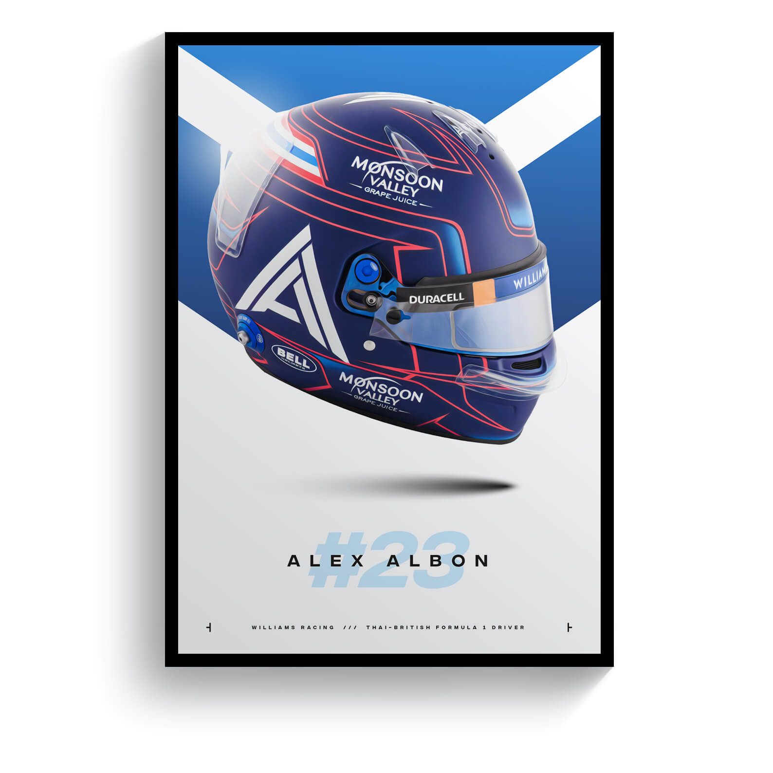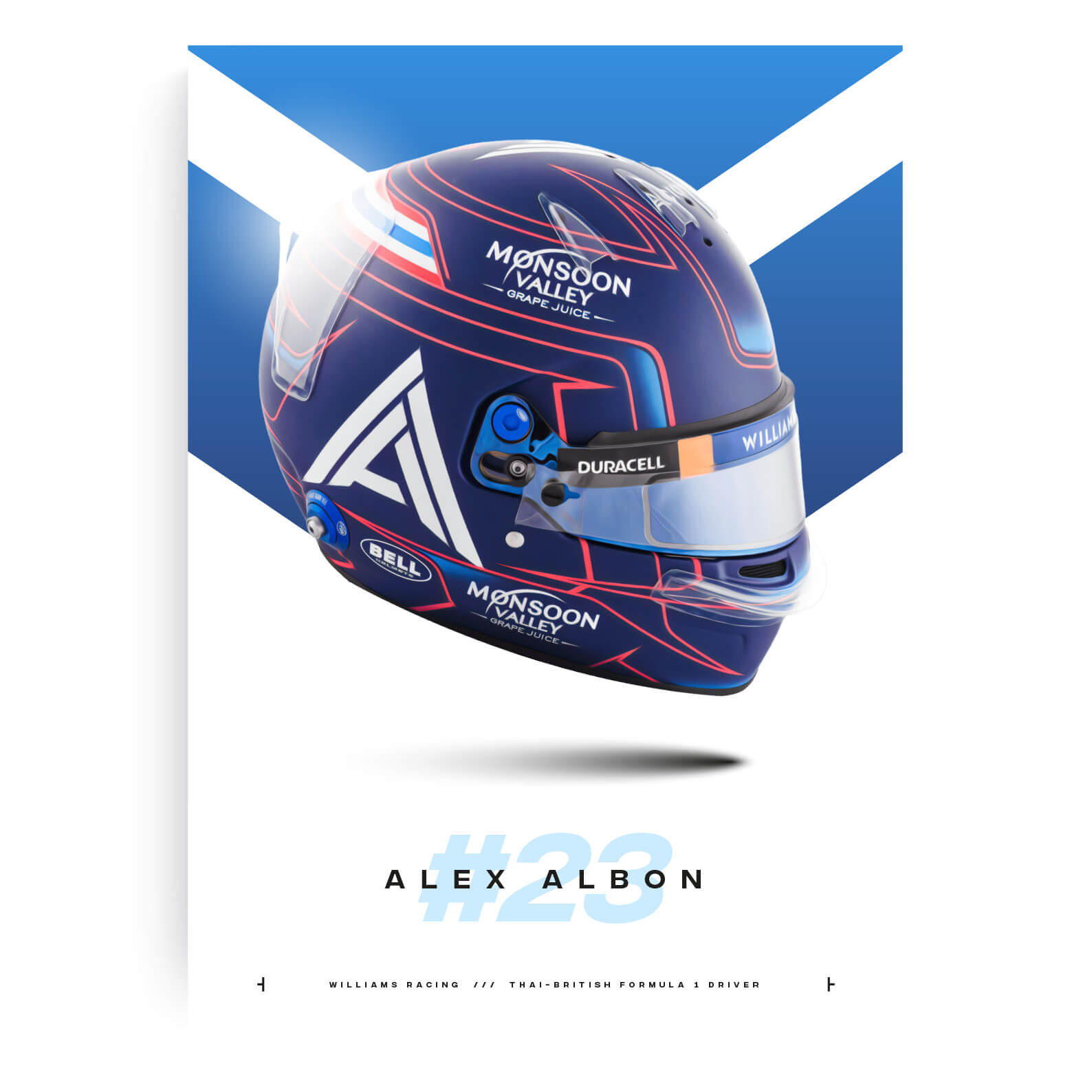 Introducing this stunning print of Alex Albon's Formula 1 helmet for the 2023 F1 season! This vibrant and detailed print showcases Albon's signature helmet design with meticulous accuracy and acknowledges Albon's Thai/British heritage and his 2023 team, Williams Racing.