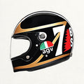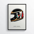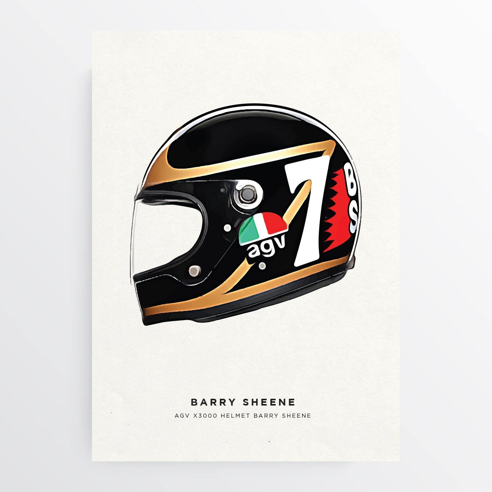 Barry Sheene was a legendary British motorcycle racer. He competed in in Grand Prix motorcycle racing which is known today as the MotoGP. Barry Sheene was a 2 time world champion winning consecutive 500cc titles in 1976 and 1977. This print of Barry Sheene's helmet features the lucky number 7.