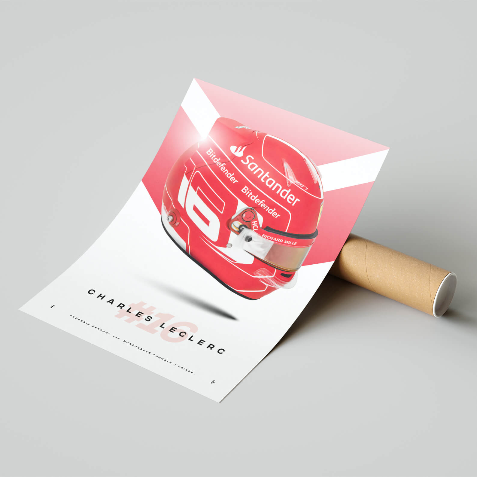 The print is produced on high-quality paper using the latest printing techniques, ensuring that every detail of the helmet design is rendered with crisp, vivid colours and razor-sharp clarity. Whether you're a dedicated fan of Charles Leclerc or simply an enthusiast of motorsports and racing culture, this print is the perfect way to add a touch of energy and excitement to your home, office, or garage.