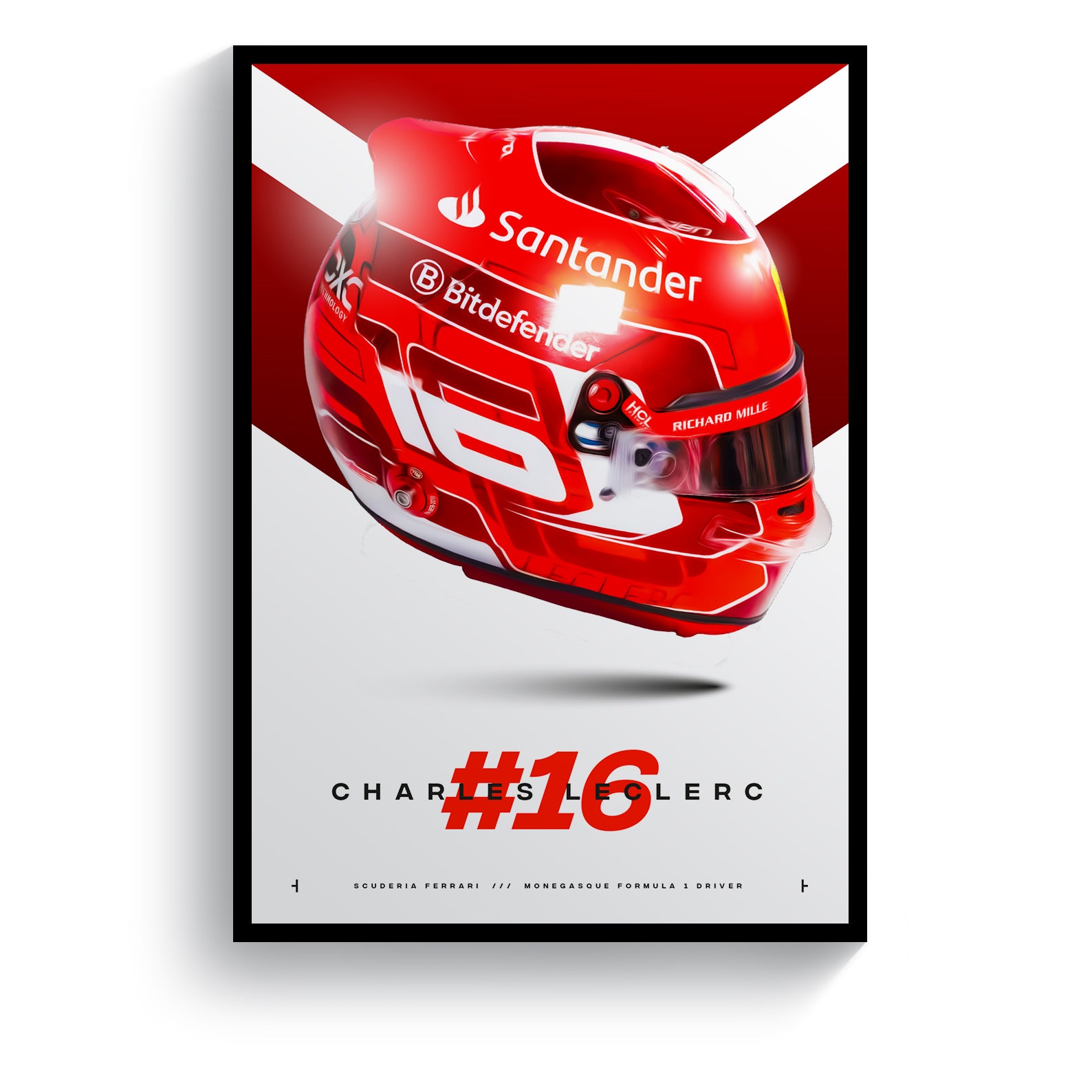 The print is produced on high-quality paper using the latest printing techniques, ensuring that every detail of the helmet design is rendered with crisp, vivid colours and razor-sharp clarity. Whether you're a dedicated fan of Charles Leclerc or simply an enthusiast of motorsports and racing culture, this print is the perfect way to add a touch of energy and excitement to your home, office, or garage.