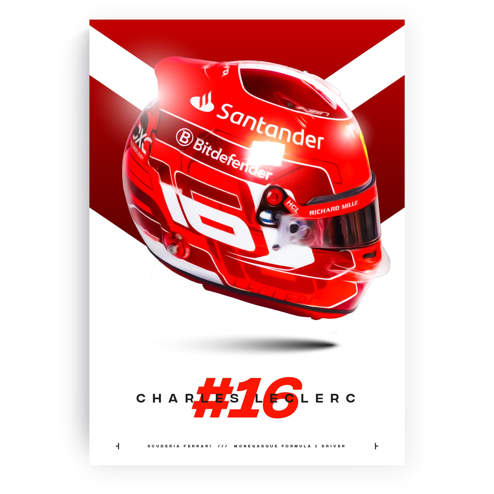 Introducing this stunning print of Charles Leclerc's Formula 1 helmet for the 2024 F1 season! This vibrant and detailed print showcases Leclerc's signature helmet design with meticulous accuracy and acknowledges Leclerc's Monegasque heritage and his 2024 team, Ferrari.