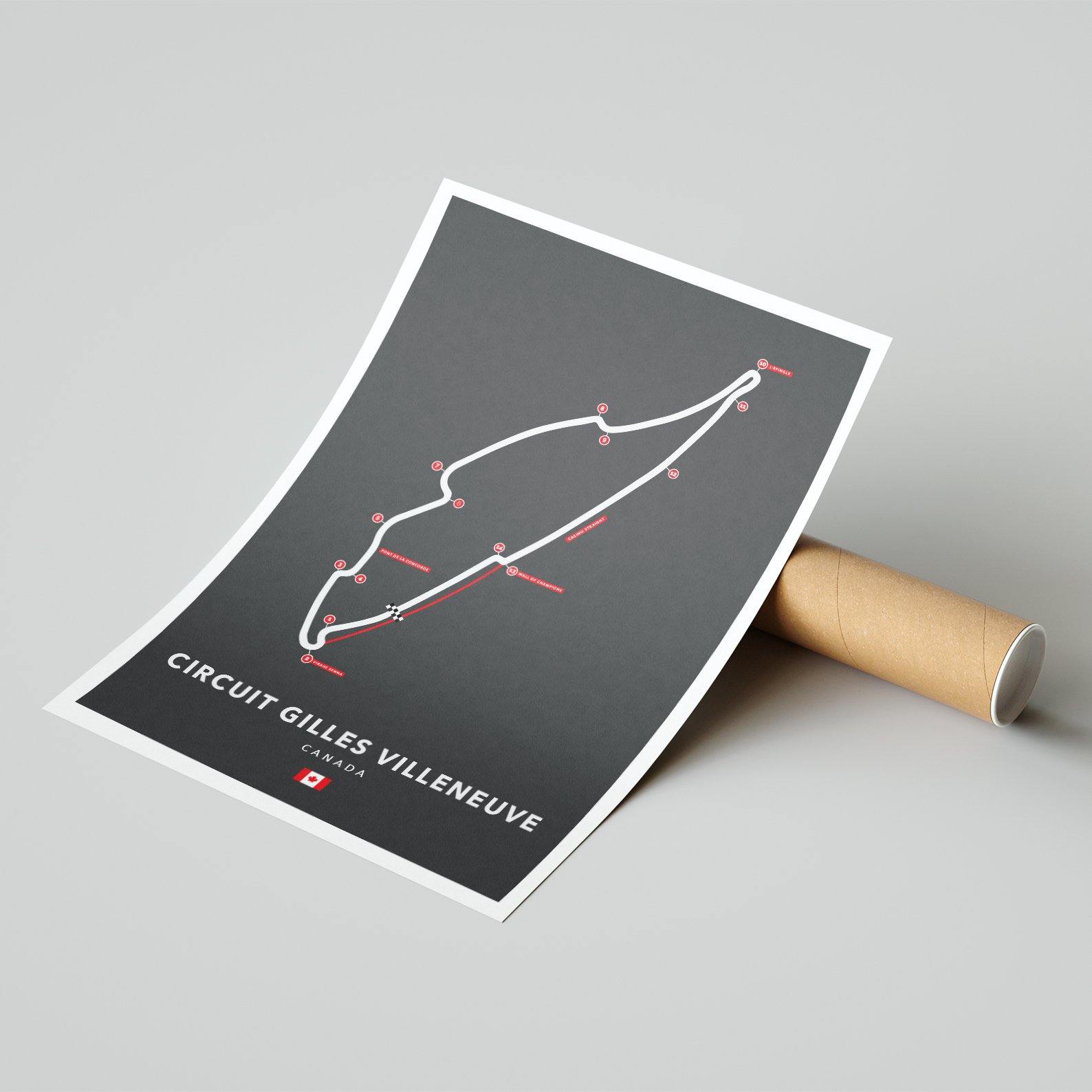 This print showcases the Circuit Gilles Villeneuve in Montreal, Quebec, Canada where the Formula One Canadian Grand Prix is held amongst other motorsport events such as NASCAR and the MotoGP.