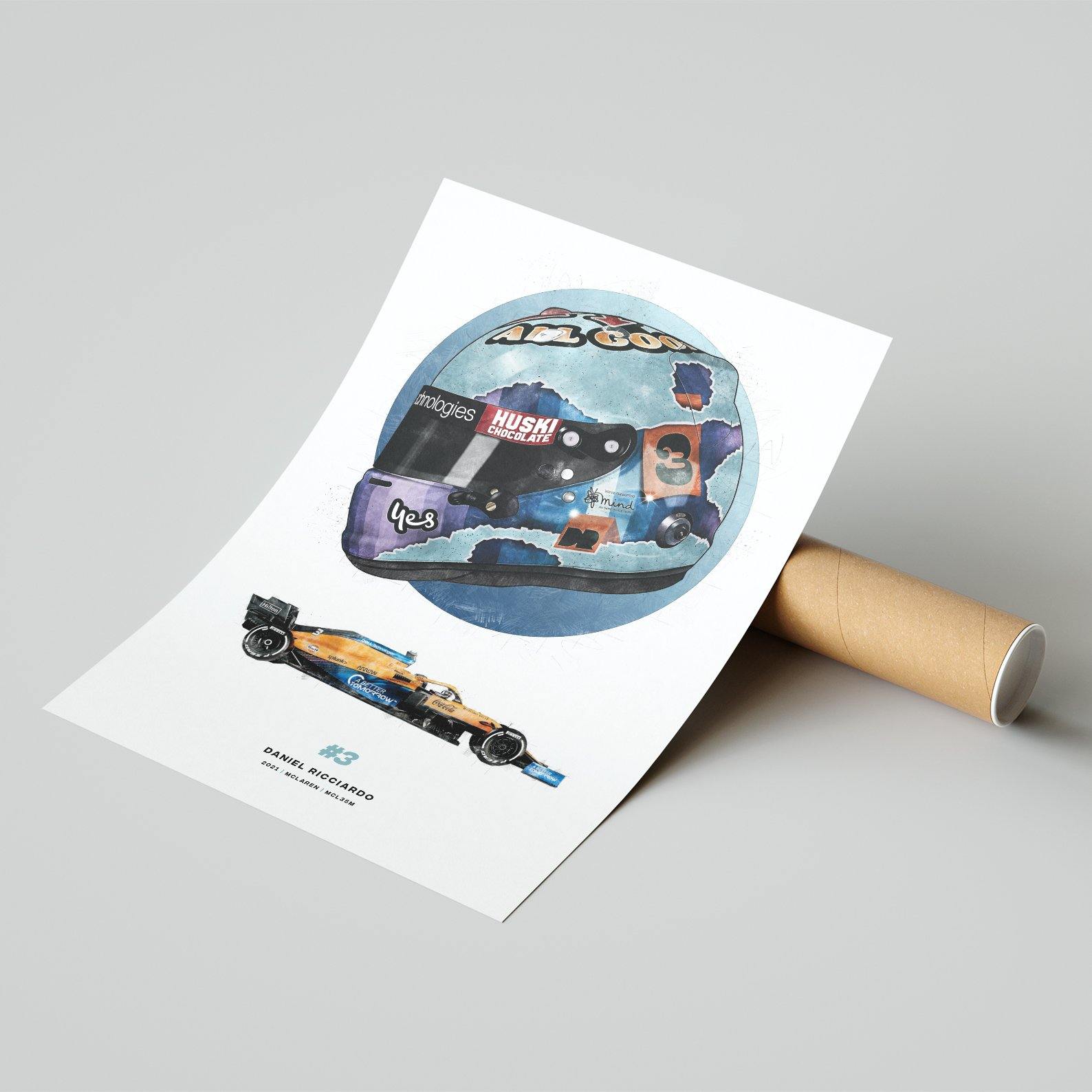 This F1 wall art print showcases Daniel Ricciardo's 2021 season helmet and McLaren MCL35M car, and is perfect for any fan of the McLaren Formula 1 racing driver. This print would look great in your home, office or garage or it could make the perfect gift for the F1 fan in your life.
