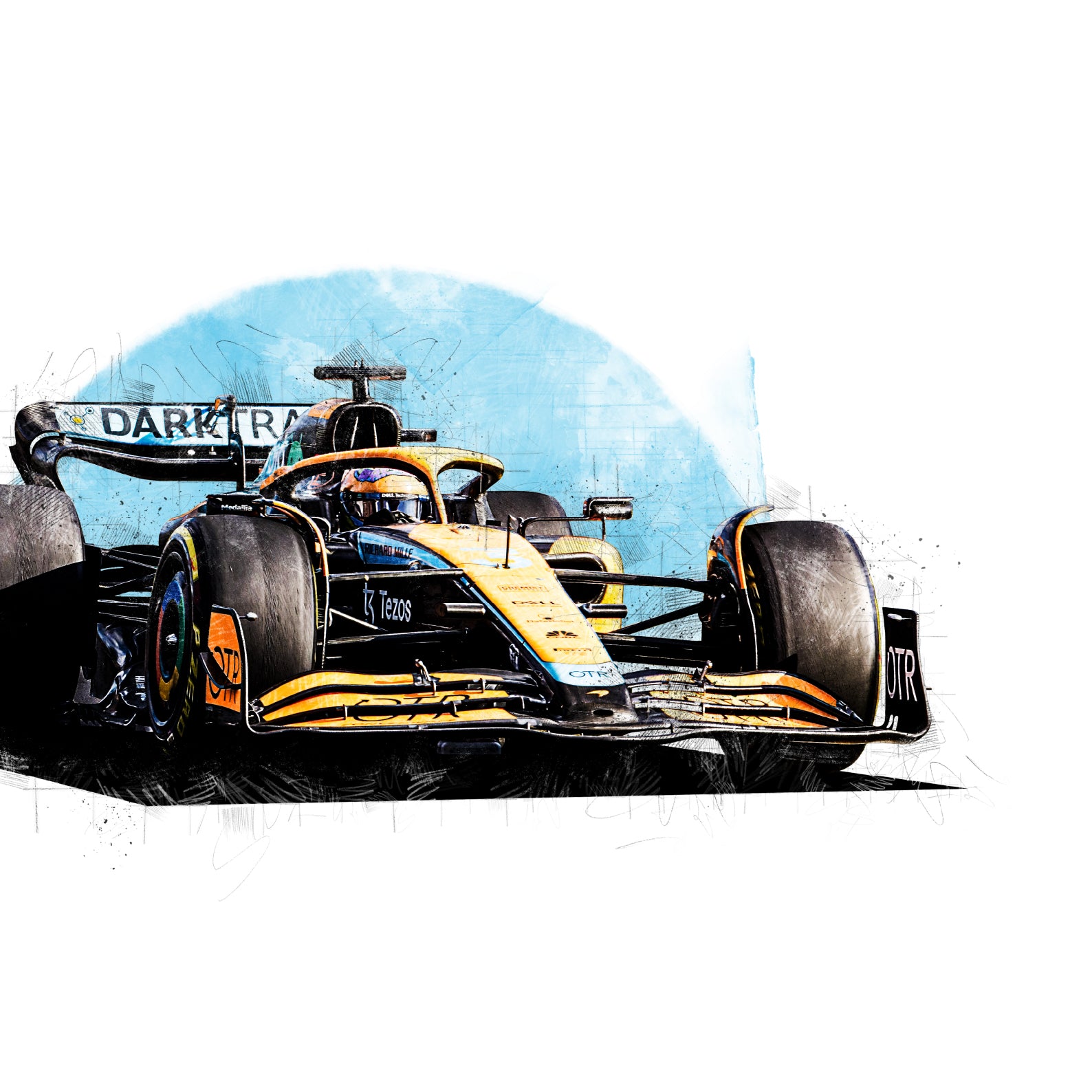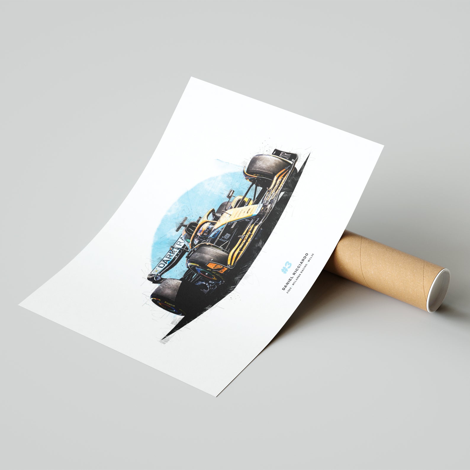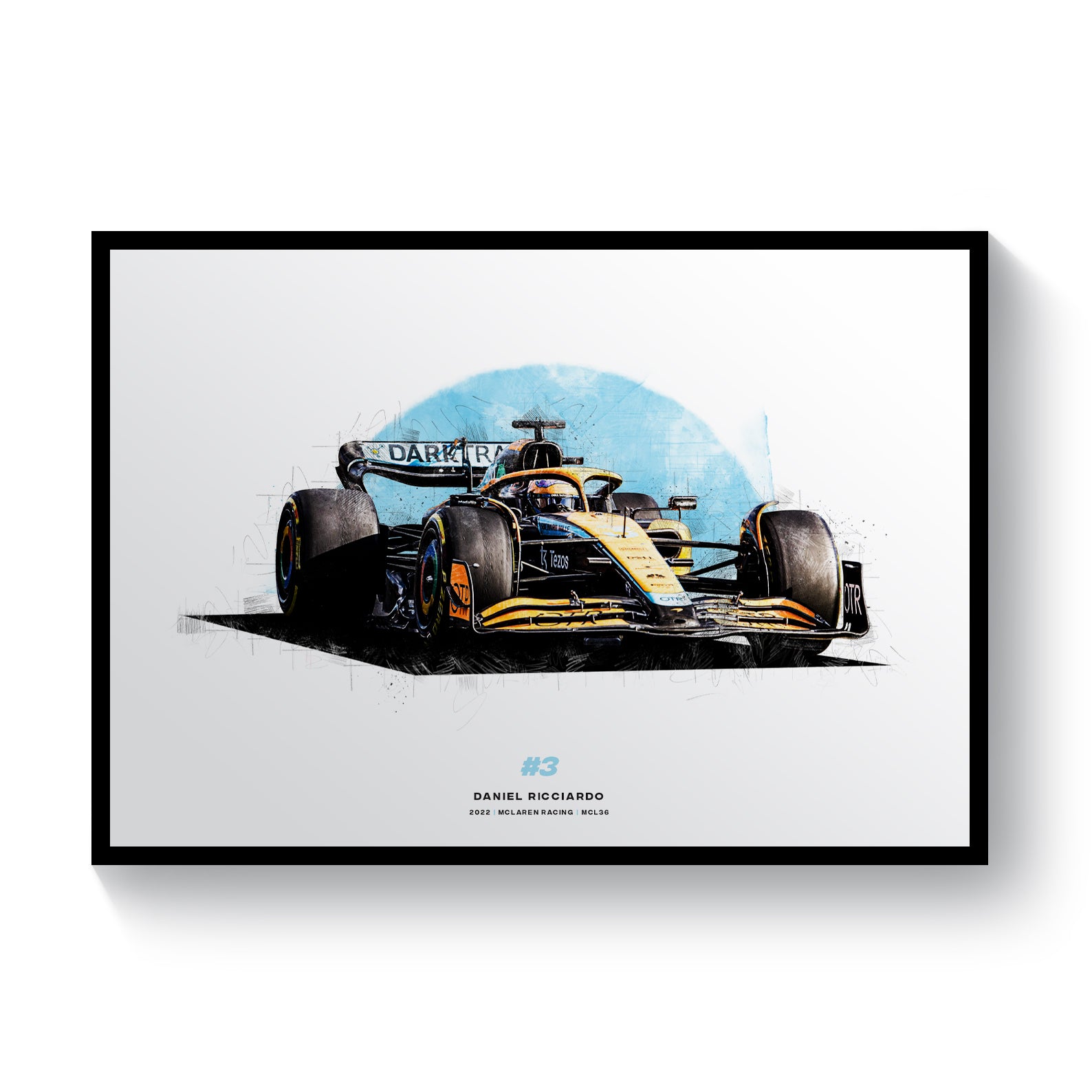 This print showcases Daniel Ricciardo's 2022 car, the McLaren MCL36 and is perfect for any fan of the McLaren Formula 1 racing driver. This Formula 1 art print has been digitally drawn and would look great in your home, office or garage or it could make the perfect gift for the F1 fan in your life.