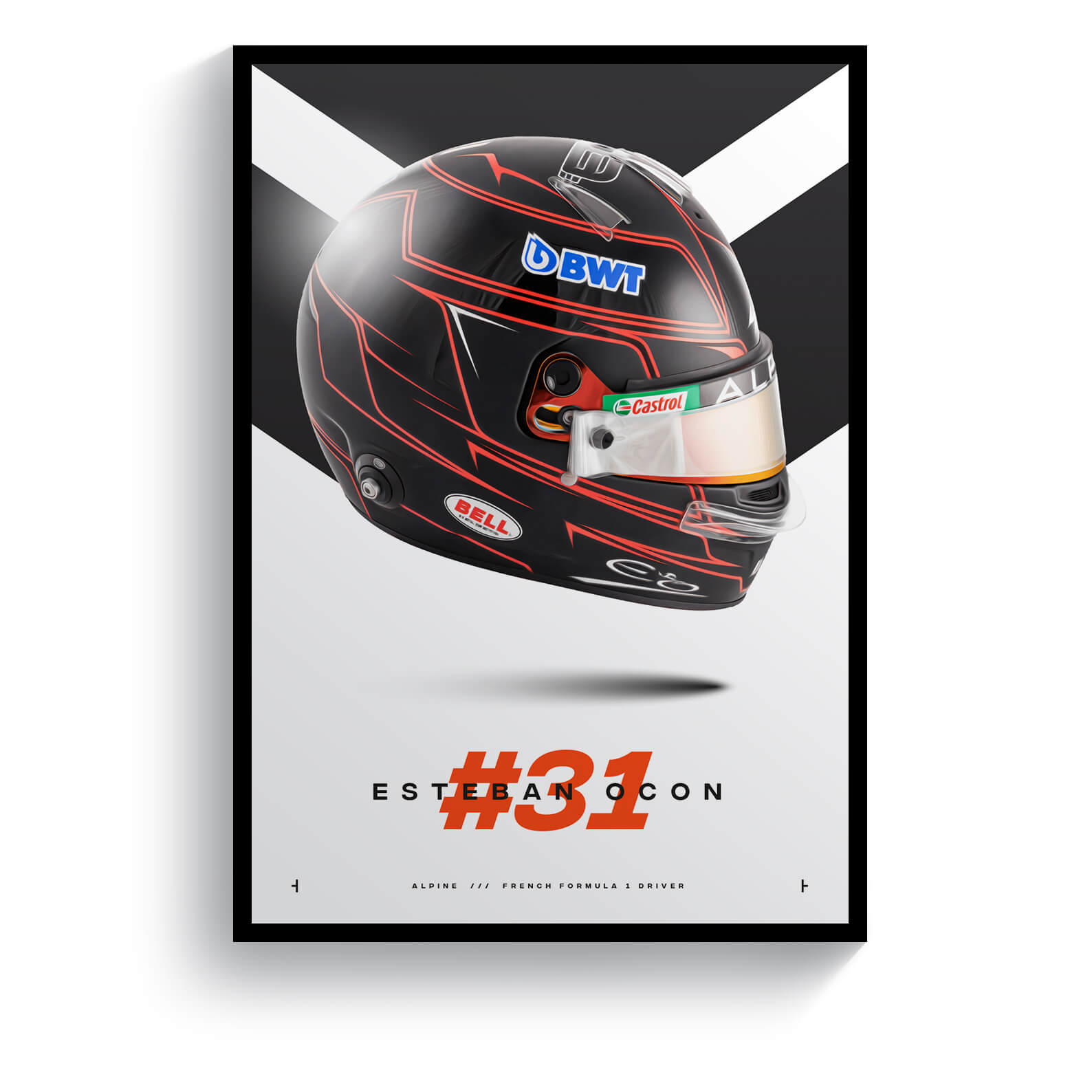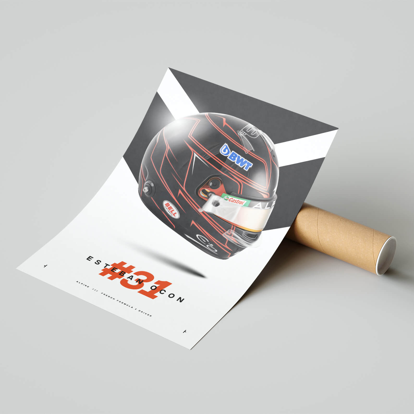 The print is produced on high-quality paper using the latest printing techniques, ensuring that every detail of the helmet design is rendered with crisp, vivid colours and razor-sharp clarity. Whether you're a dedicated fan of Esteban Ocon or simply an enthusiast of motorsports and racing culture, this print is the perfect way to add a touch of energy and excitement to your home, office, or garage.