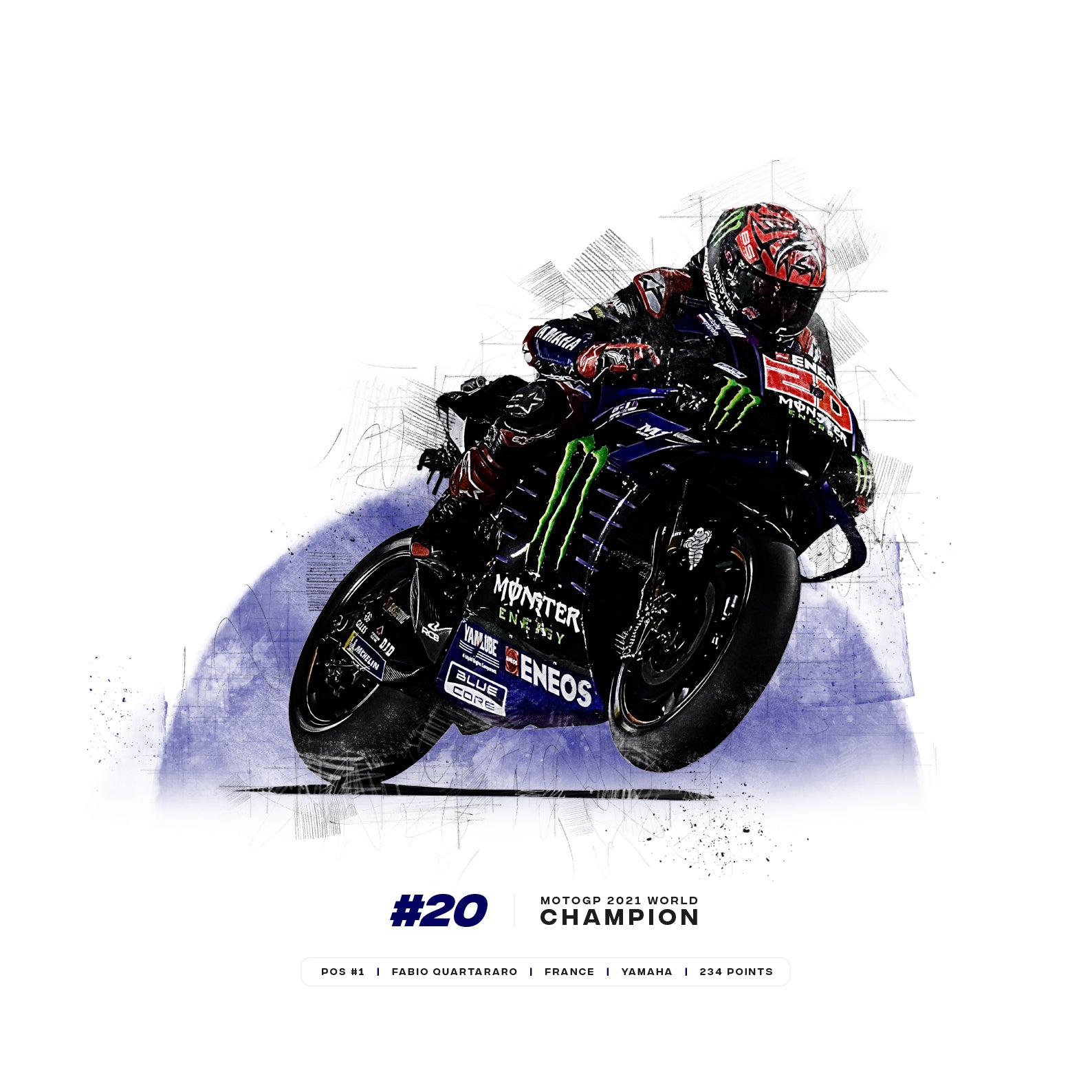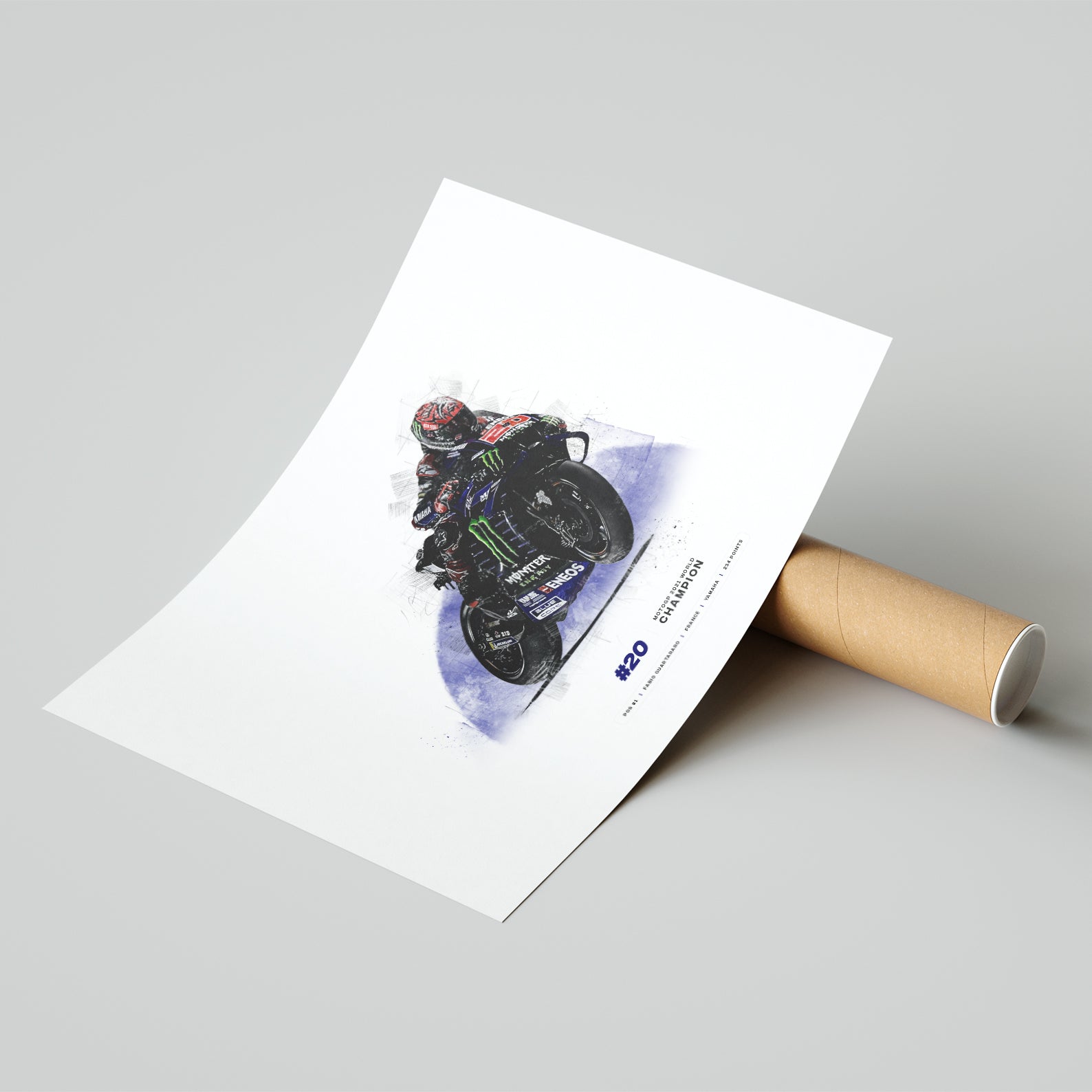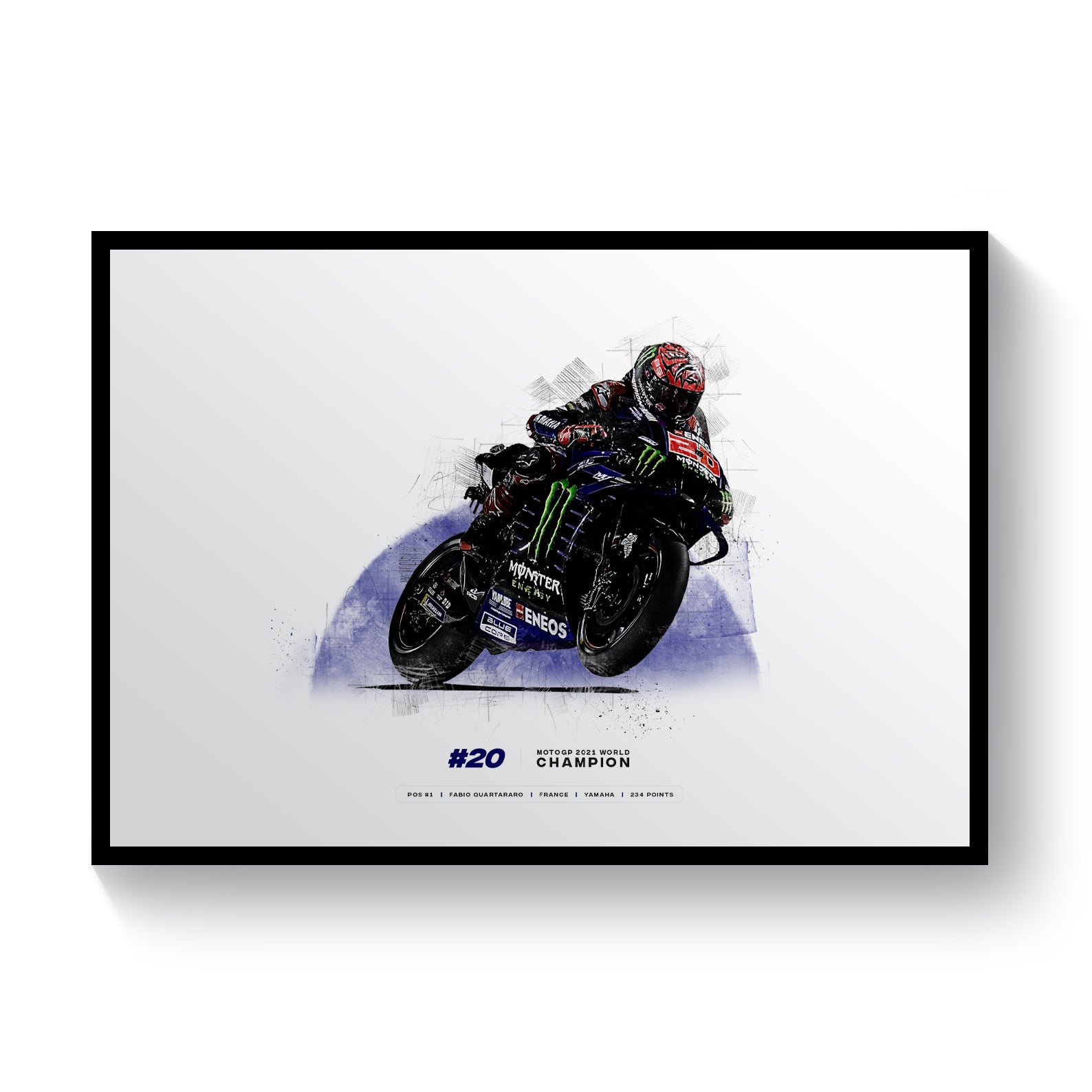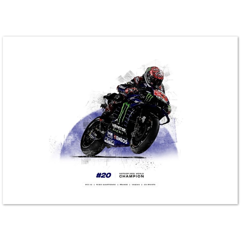 Celebrate the incredible feat of Fabio Quartararo becoming the 2021 MotoGP World Champion with this exclusive print. Featuring the Yamaha Racing rider on his motorcycle, this commemorative print is a must-have for any MotoGP fan. Commemorate the 2021 World Champion and support your favorite rider in style.