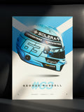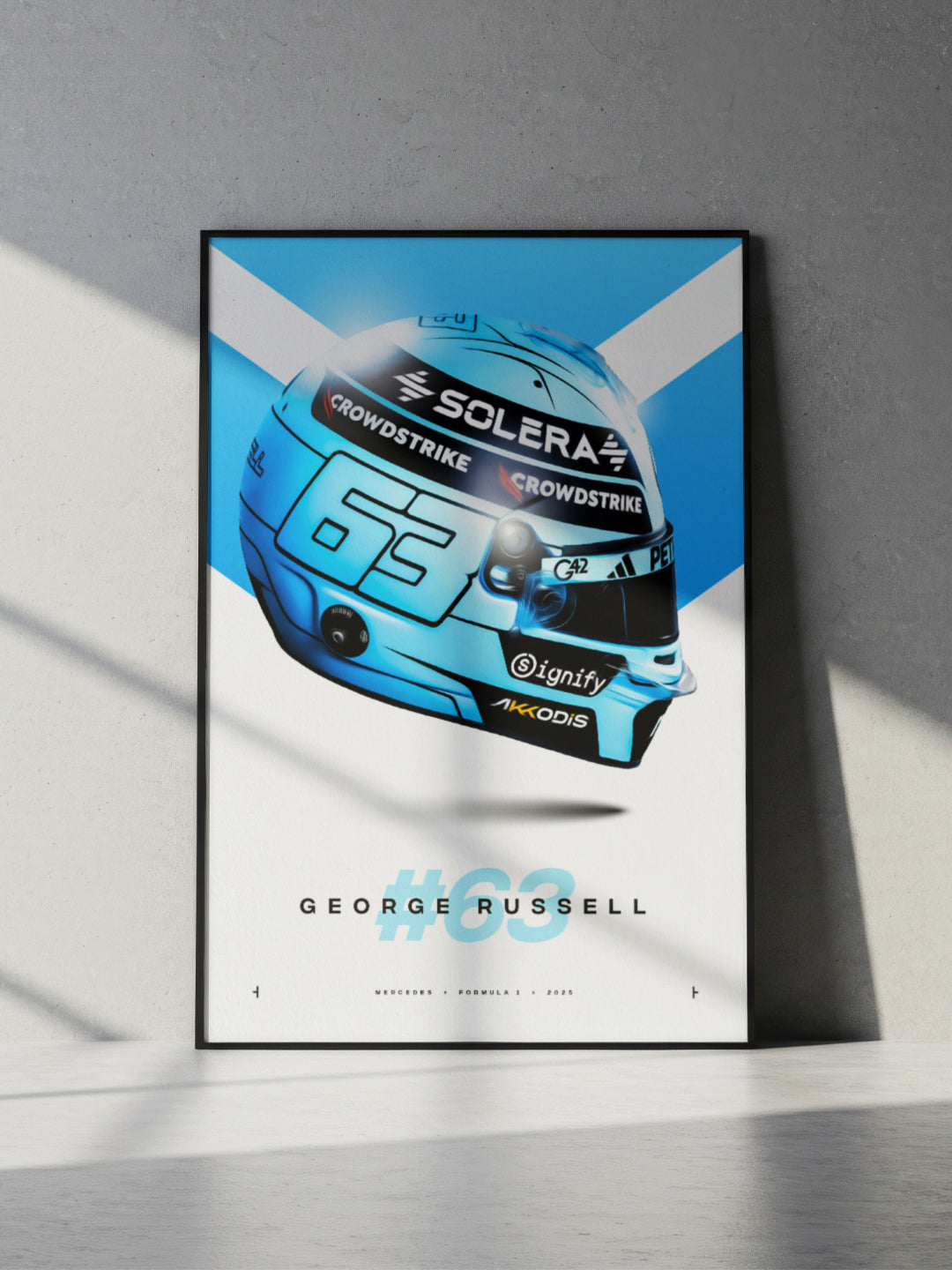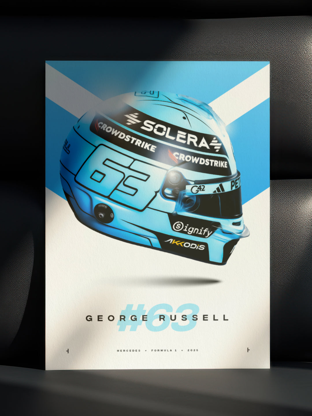 Introducing this stunning print of George Russell's Formula 1 helmet for the 2025 F1 season! This vibrant and detailed print showcases Russell's signature helmet design with meticulous accuracy and his 2025 team, Mercedes.