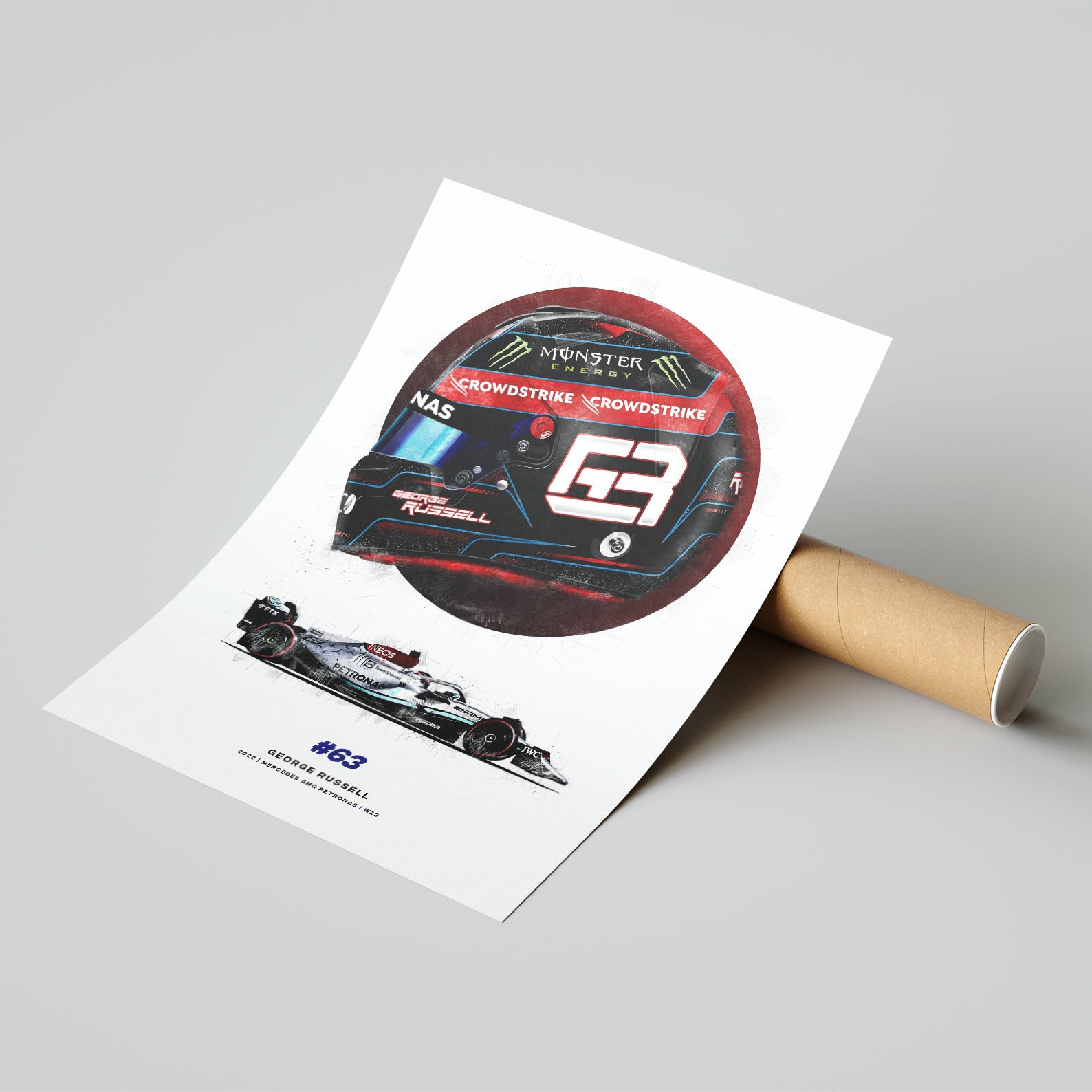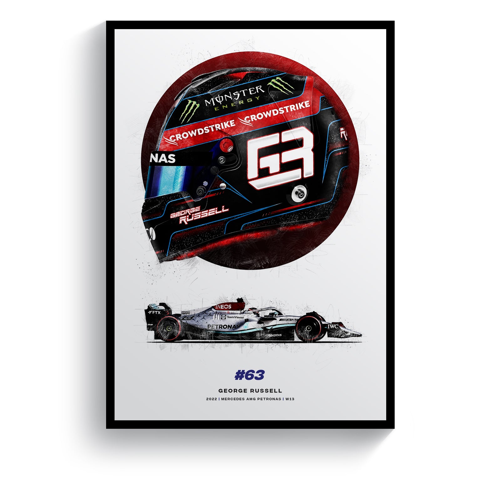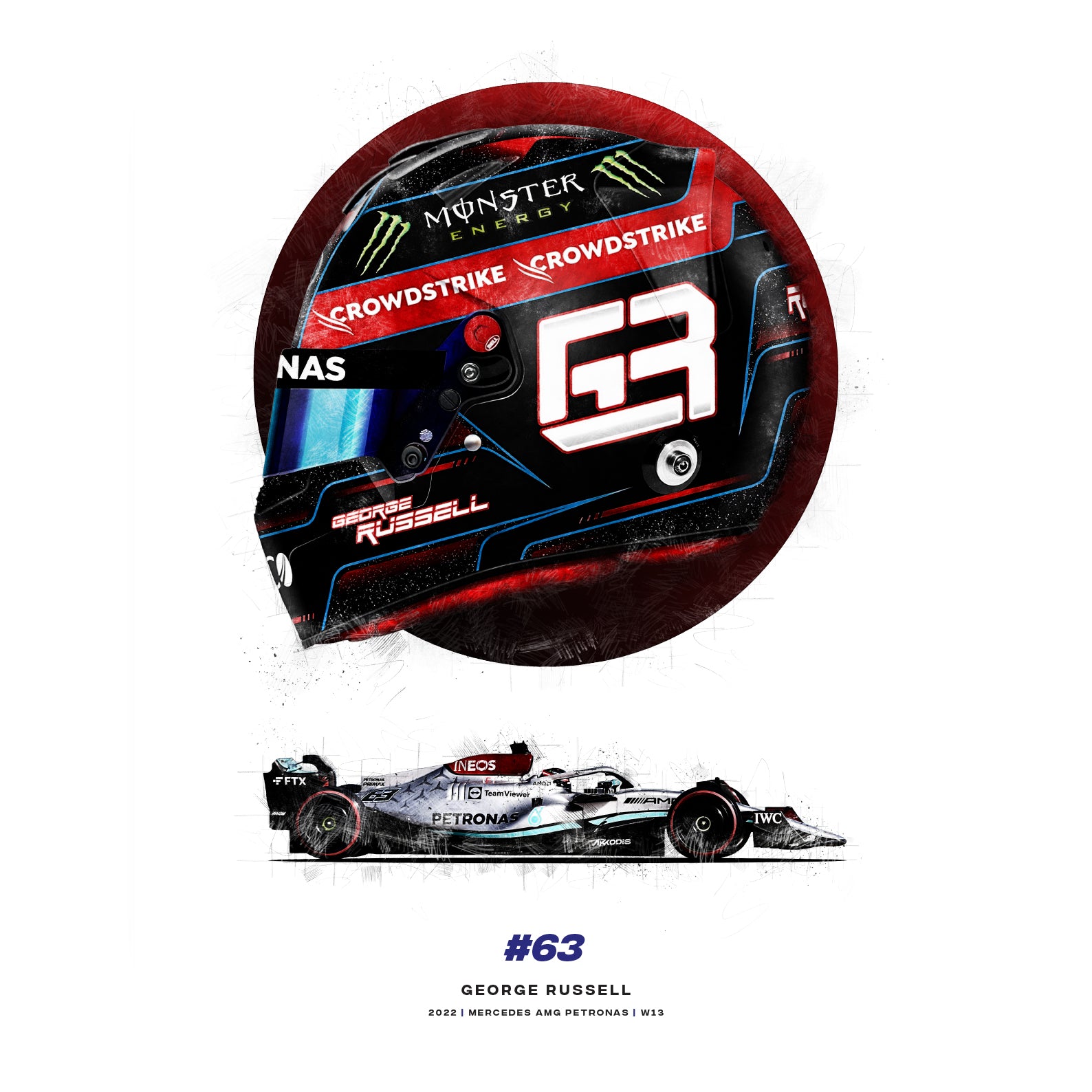 This Formula 1 print showcases George Russell's 2022 season helmet and Mercedes AMG Petronas W13, and is perfect for any fan of the Mercedes Formula 1 racing driver. This print has been digitally painted and would look great in your home, office or garage or it could make the perfect gift for the F1 fan in your life.