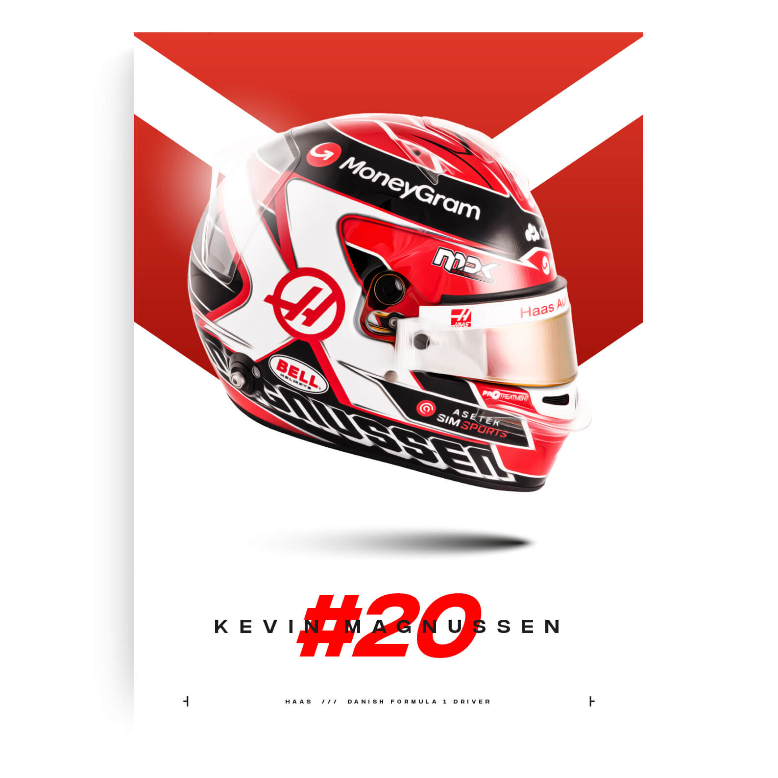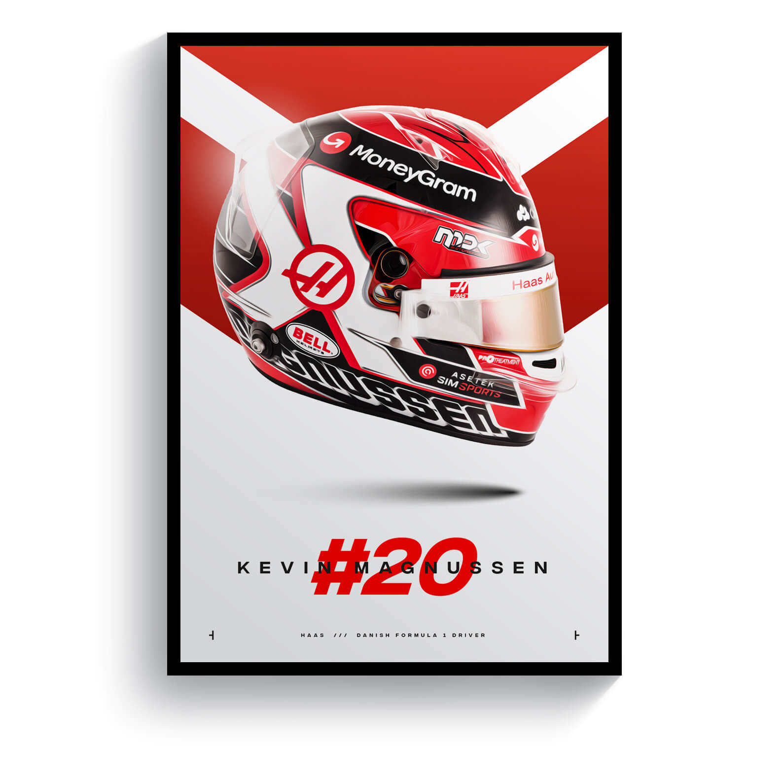 Introducing this stunning print of Kevin Magnussen's Formula 1 helmet for the 2023 F1 season! This vibrant and detailed print showcases Magnussen's signature helmet design with meticulous accuracy and acknowledges Magnussen's Danish heritage and his 2023 team, Haas.