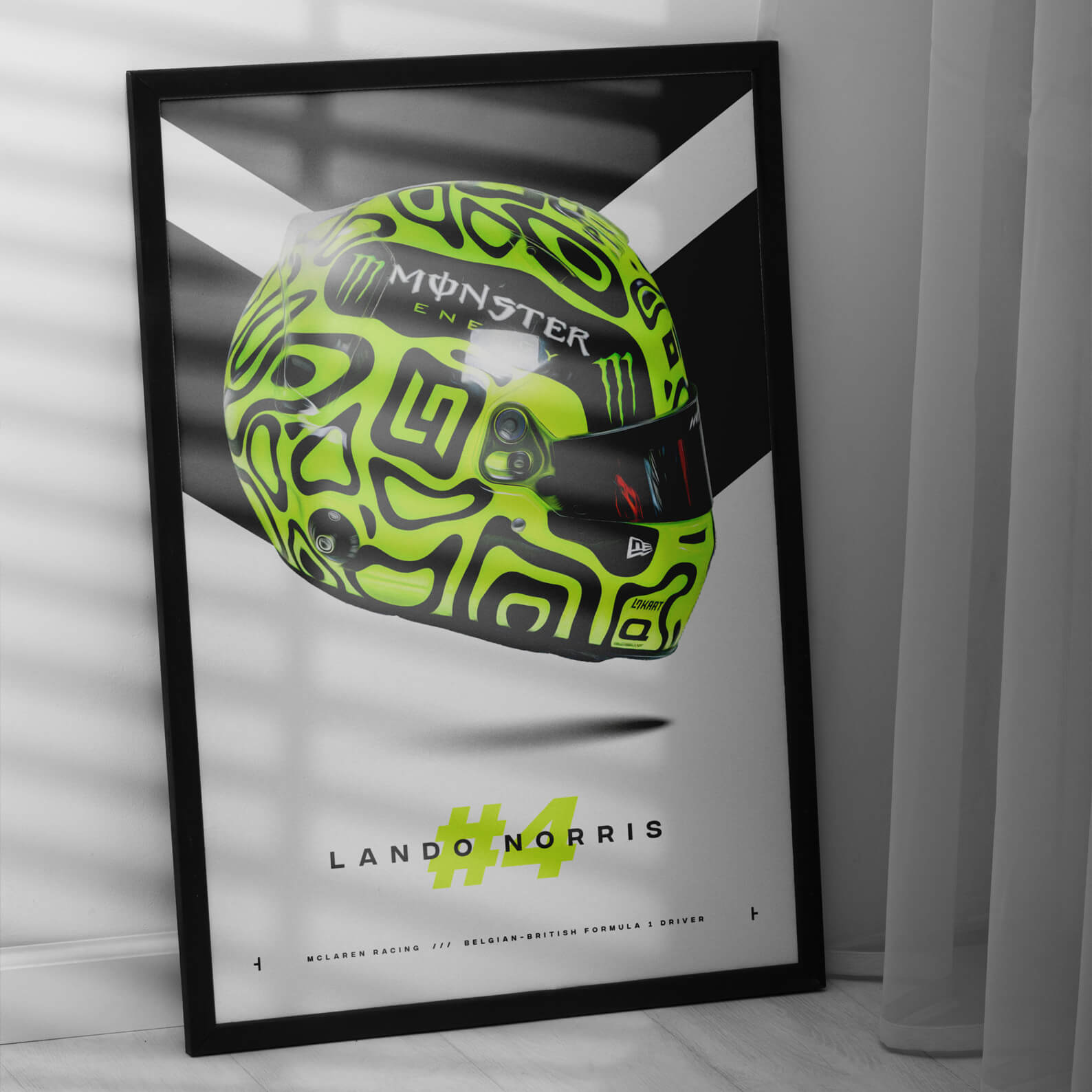 The print is produced on high-quality paper using the latest printing techniques, ensuring that every detail of the helmet design is rendered with crisp, vivid colours and razor-sharp clarity. Whether you're a dedicated fan of Lando Norris or simply an enthusiast of motorsports and racing culture, this print is the perfect way to add a touch of energy and excitement to your home, office, or garage.