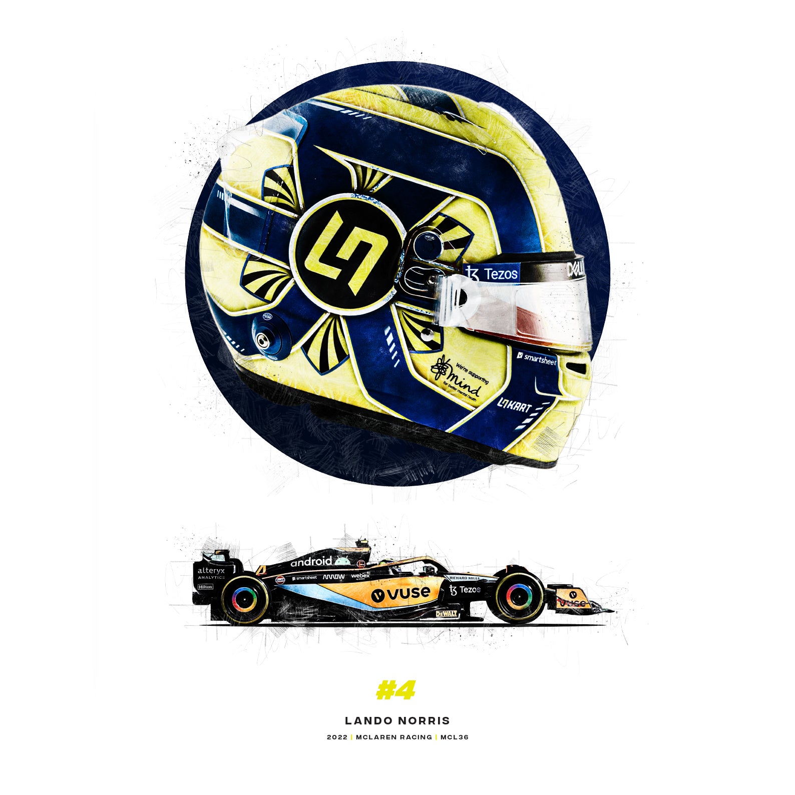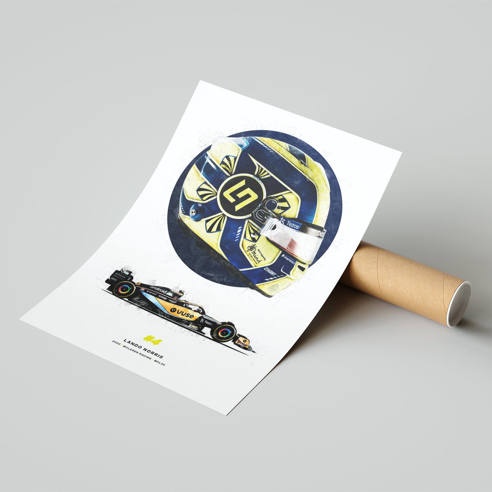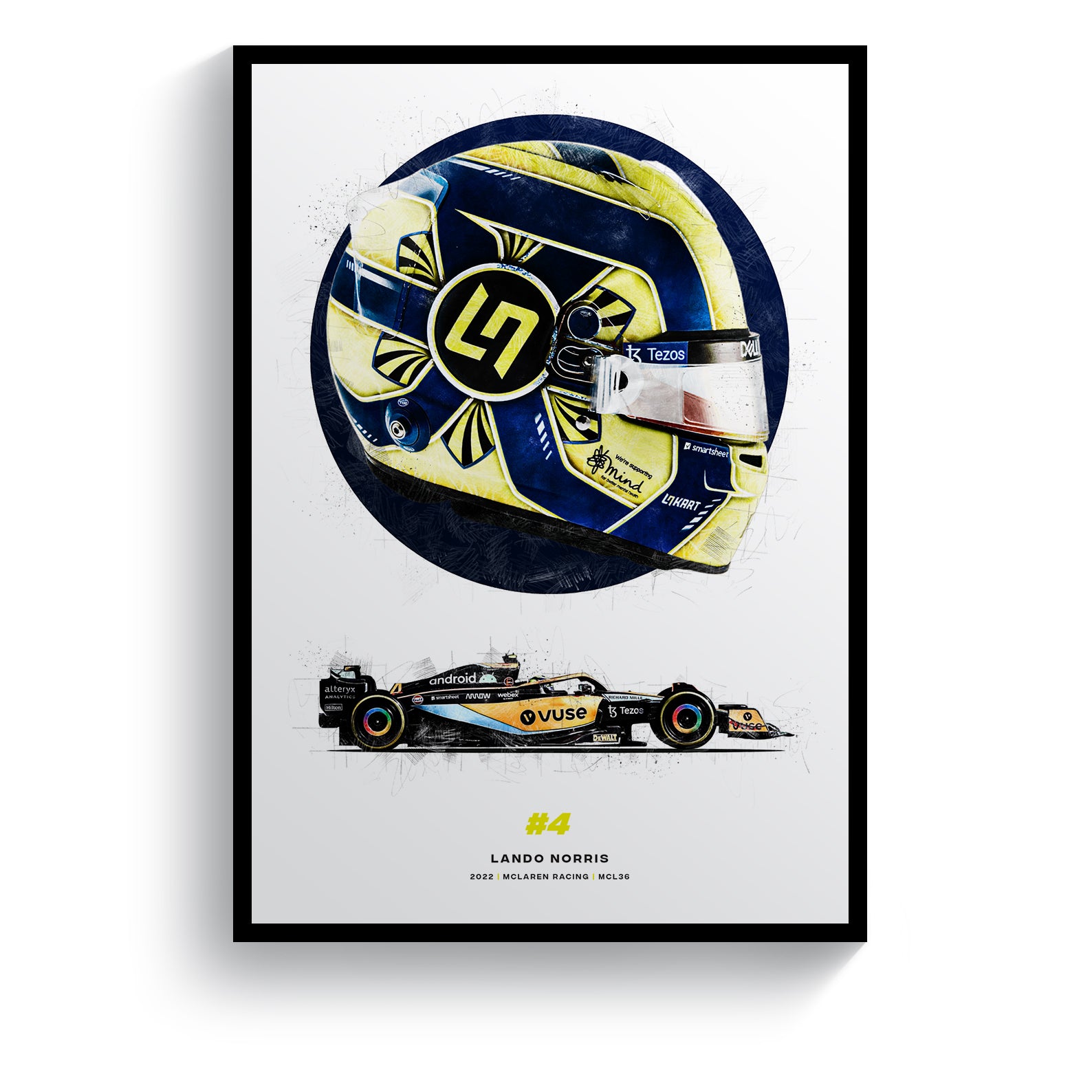 This print showcases Lando Norris' 2022 season helmet and McLaren MCL36 car, and is perfect for any fan of the McLaren Formula 1 racing driver. Formula 1 prints like these would look great in your home, office or garage or it could make the perfect gift for the F1 fan in your life.