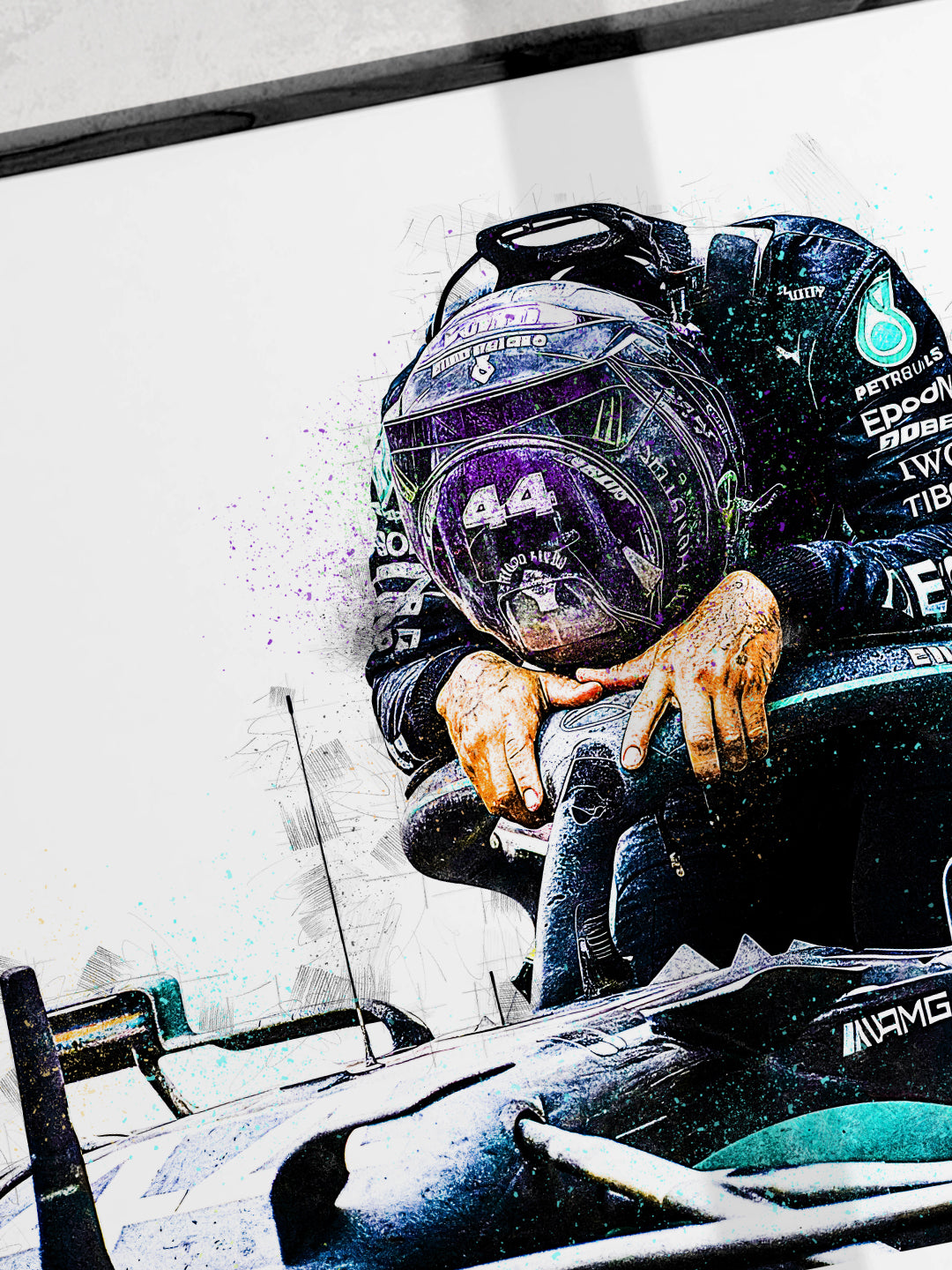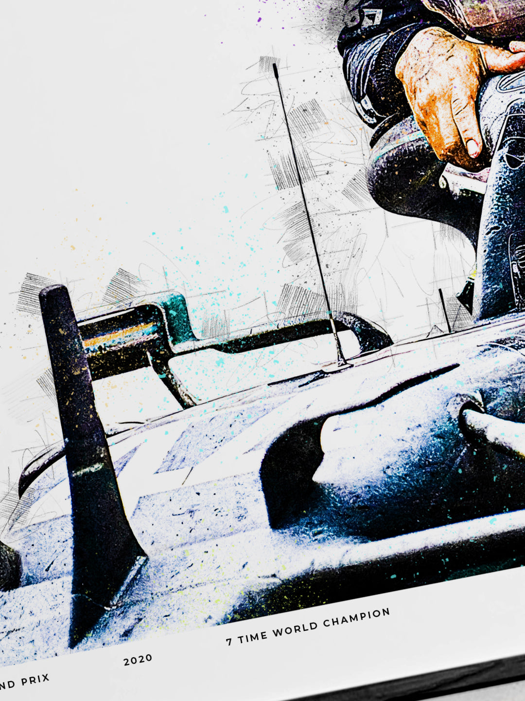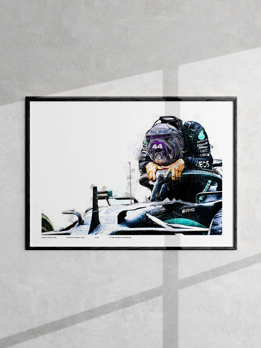 This print blends sketch-work textures, layered splashes, and raw detail to bring the emotion of Turkey 2020 straight onto your wall. A must-have for any Hamilton fan and a defining chapter of modern F1.