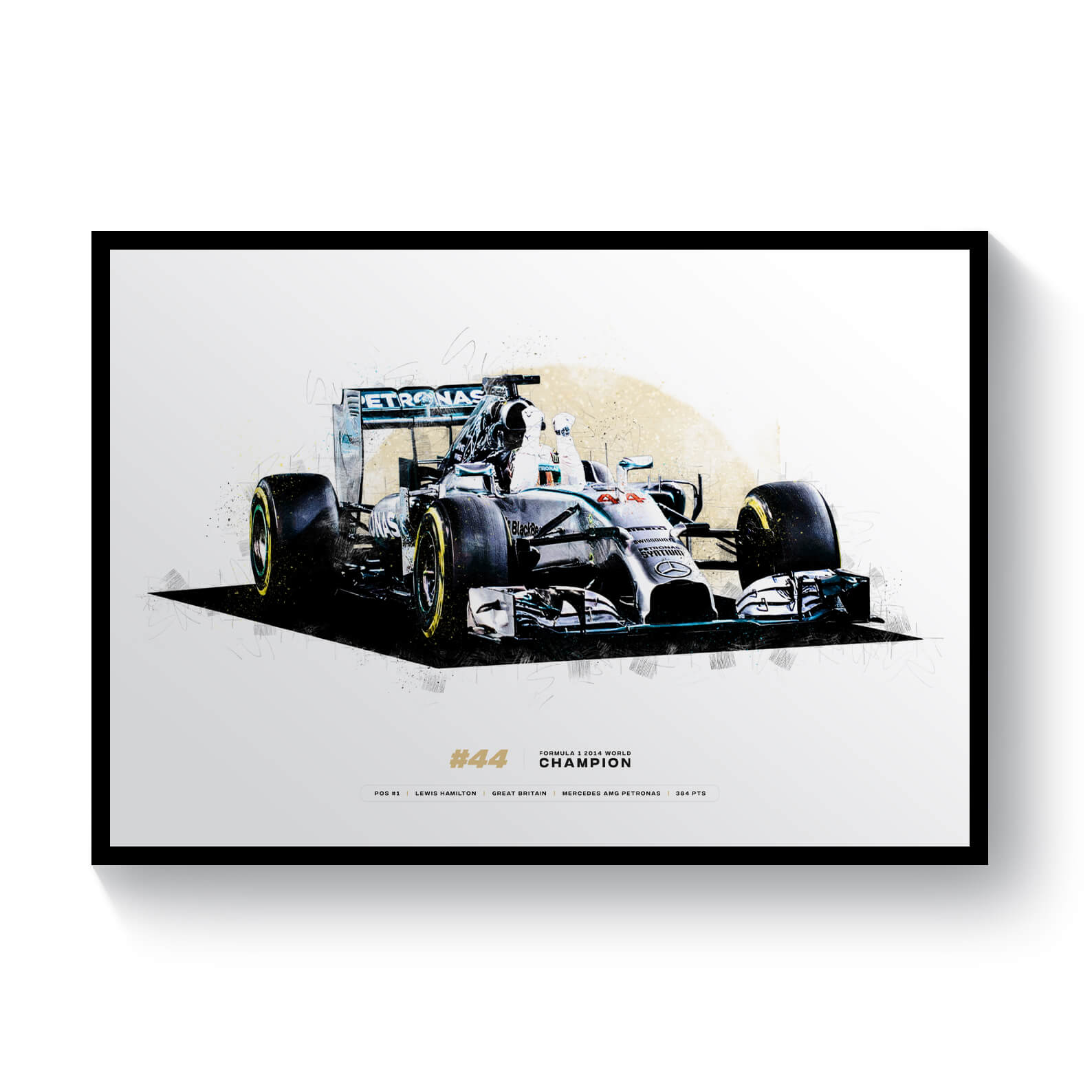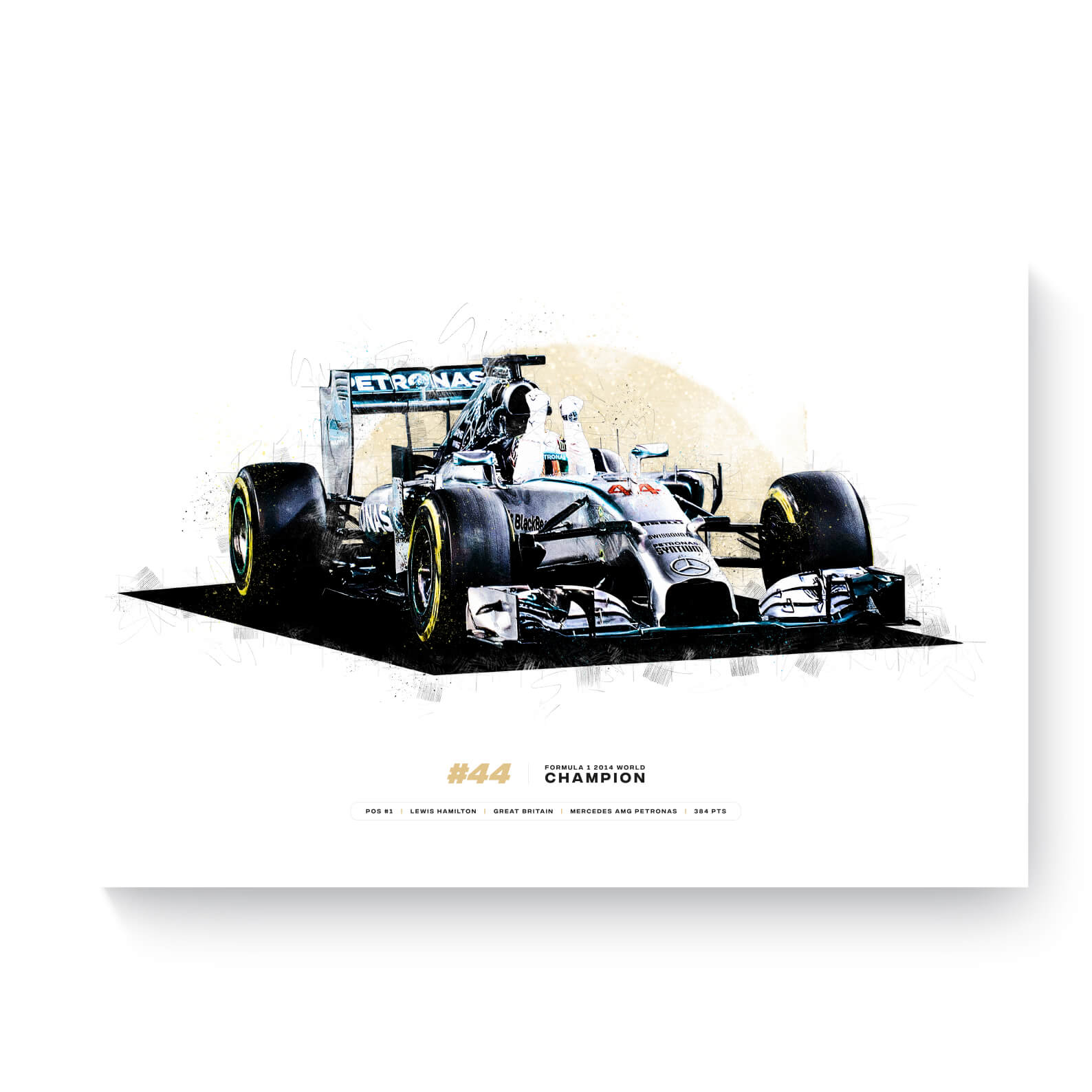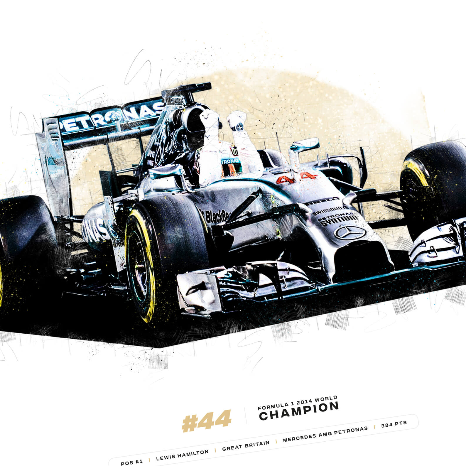 Introducing our Lewis Hamilton 2014 World Champion F1 art print, showcasing Hamilton's Mercedes W05 Formula 1 car from the final race of the 2014 season at the Abu Dhabi Grand Prix. Lewis Hamilton took his 33rd career win and his second Driver's World Championship.