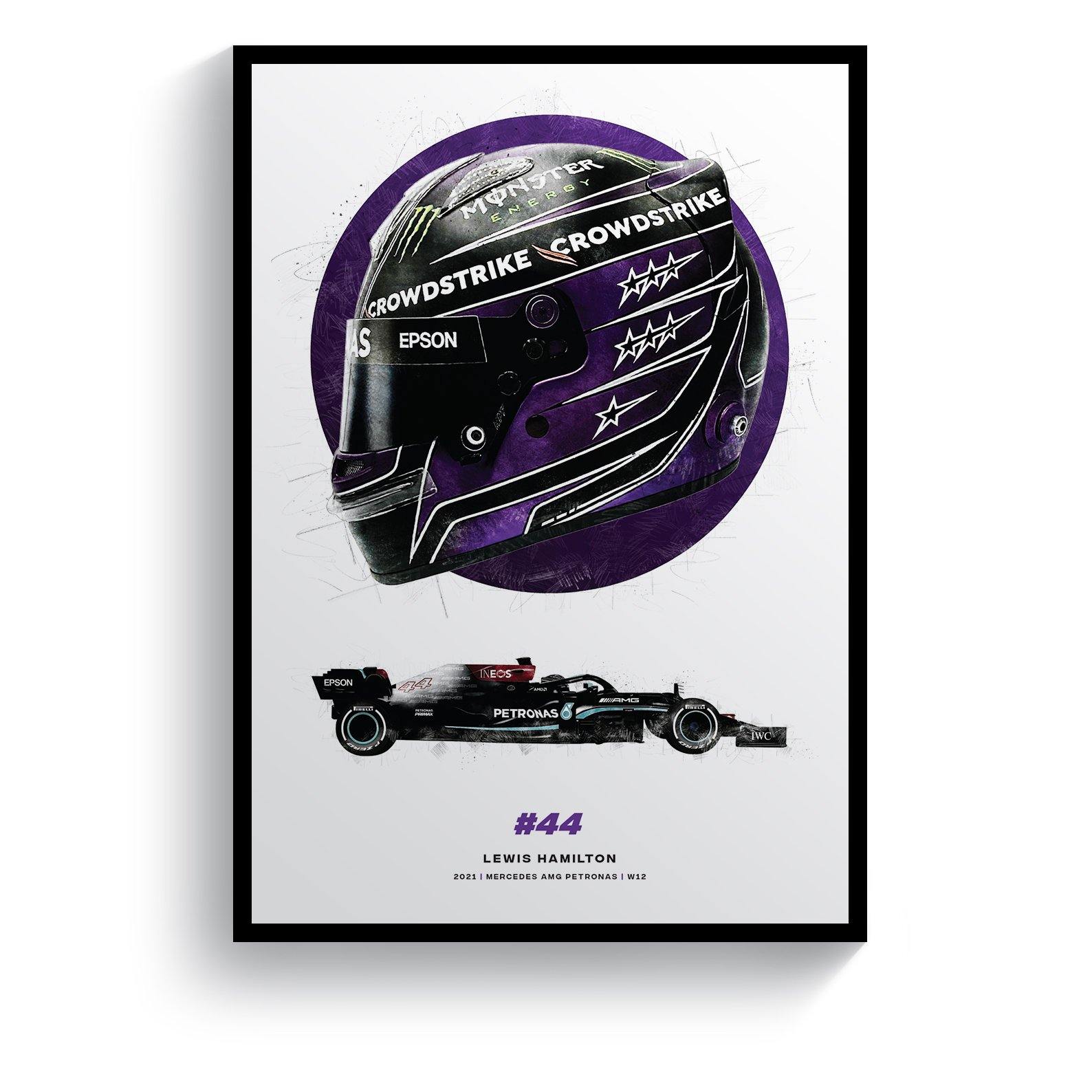 This F1 print showcases Lewis Hamilton's 2021 season helmet and Mercedes AMG Petronas W12 car, and is perfect for any fan of the Mercedes Formula 1 racing driver. This print would look great in your home, office or garage or it could make the perfect gift for the F1 fan in your life.