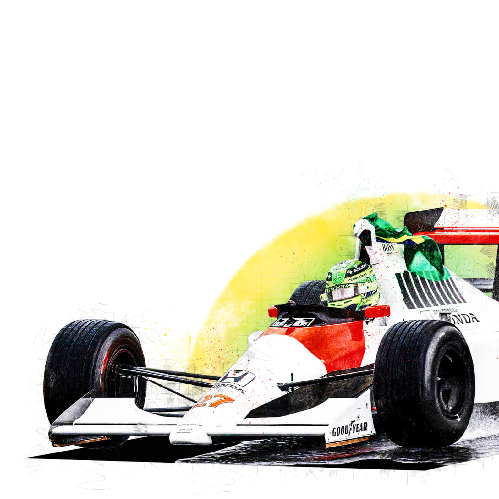 In a tribute to his hero, Lewis Hamilton described driving Ayrton Senna’s McLaren MP4/5B at Interlagos as one of the greatest honours of his career. This print captures that unforgettable moment, merging the legacies of two of Formula 1’s greatest champions. With its stunning depiction of Hamilton embracing Senna's spirit on Brazilian soil, this print is more than just art – it’s a piece of F1 history.