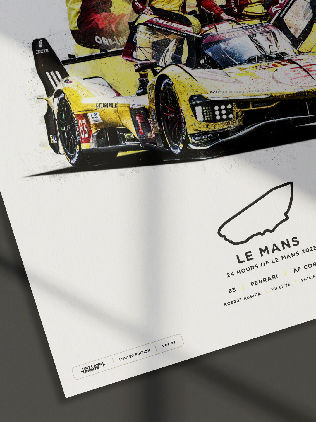 This exclusive artwork captures the unforgettable moment Ferrari AF Corse’s #83 Ferrari 499P took victory at the 2025 24 Hours of Le Mans, driven by Robert Kubica, Yifei Ye, and Phil Hanson.