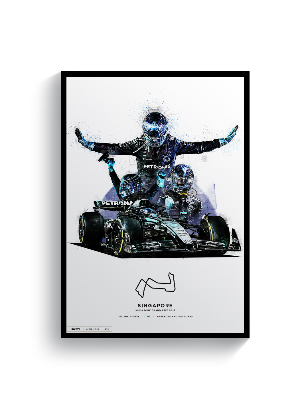 Celebrate George Russell’s incredible victory at the 2025 Singapore Grand Prix with this exclusive limited edition F1 art print. Driving for Mercedes-AMG Petronas, Russell delivered a commanding performance under the lights at Marina Bay, showcasing precision, pace and control on one of the toughest circuits on the calendar.