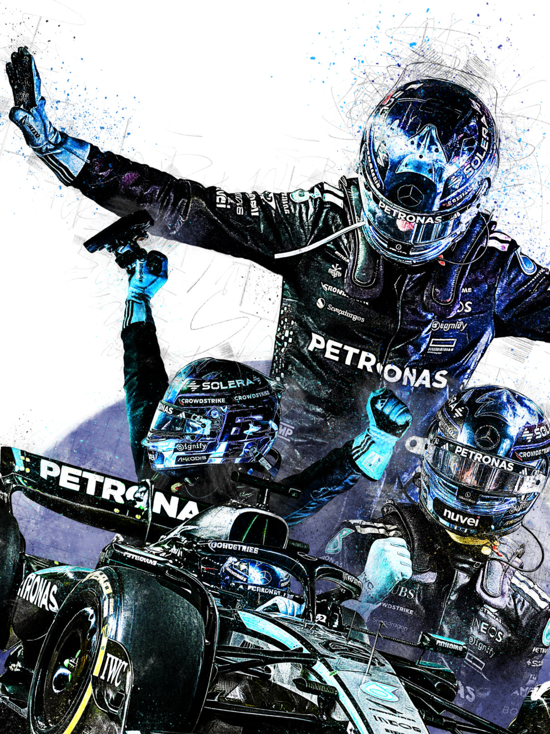 This artwork captures Russell’s celebration and his Mercedes W16, combining striking detail and bold colour to reflect the intensity of the night race. A defining moment in Russell’s career and a standout performance for Mercedes in the 2025 Formula 1 season.