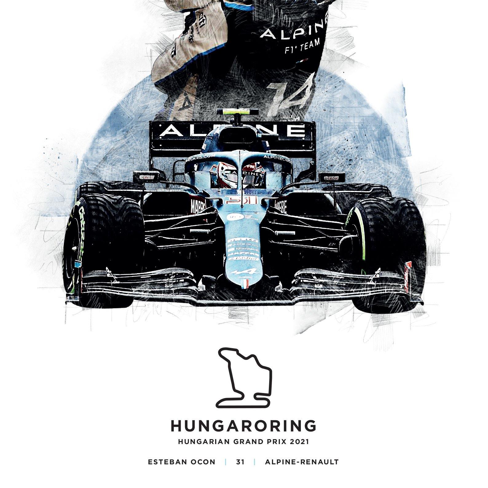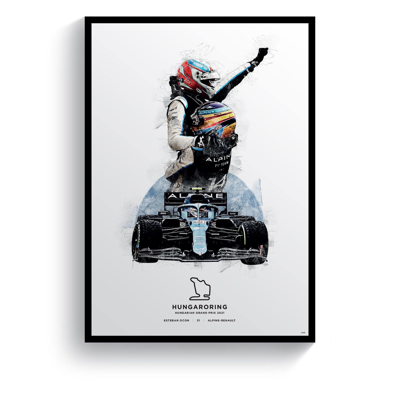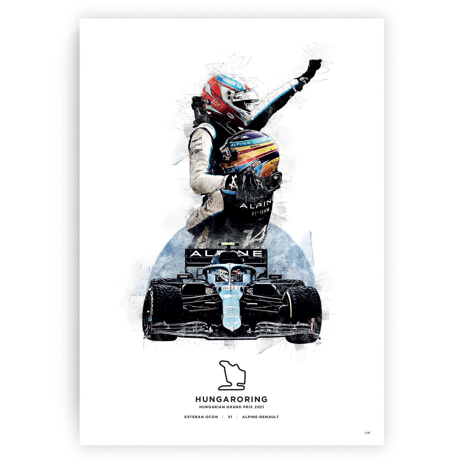 Esteban Ocon takes his first Formula 1 win at the 2021 Hungarian Grand Prix. After starting 8th and staying out of trouble at turn 1, Esteban held onto the lead to claim victory for him and Alpine. Our limited edition print features Alonso and Ocon celebrating after the race.