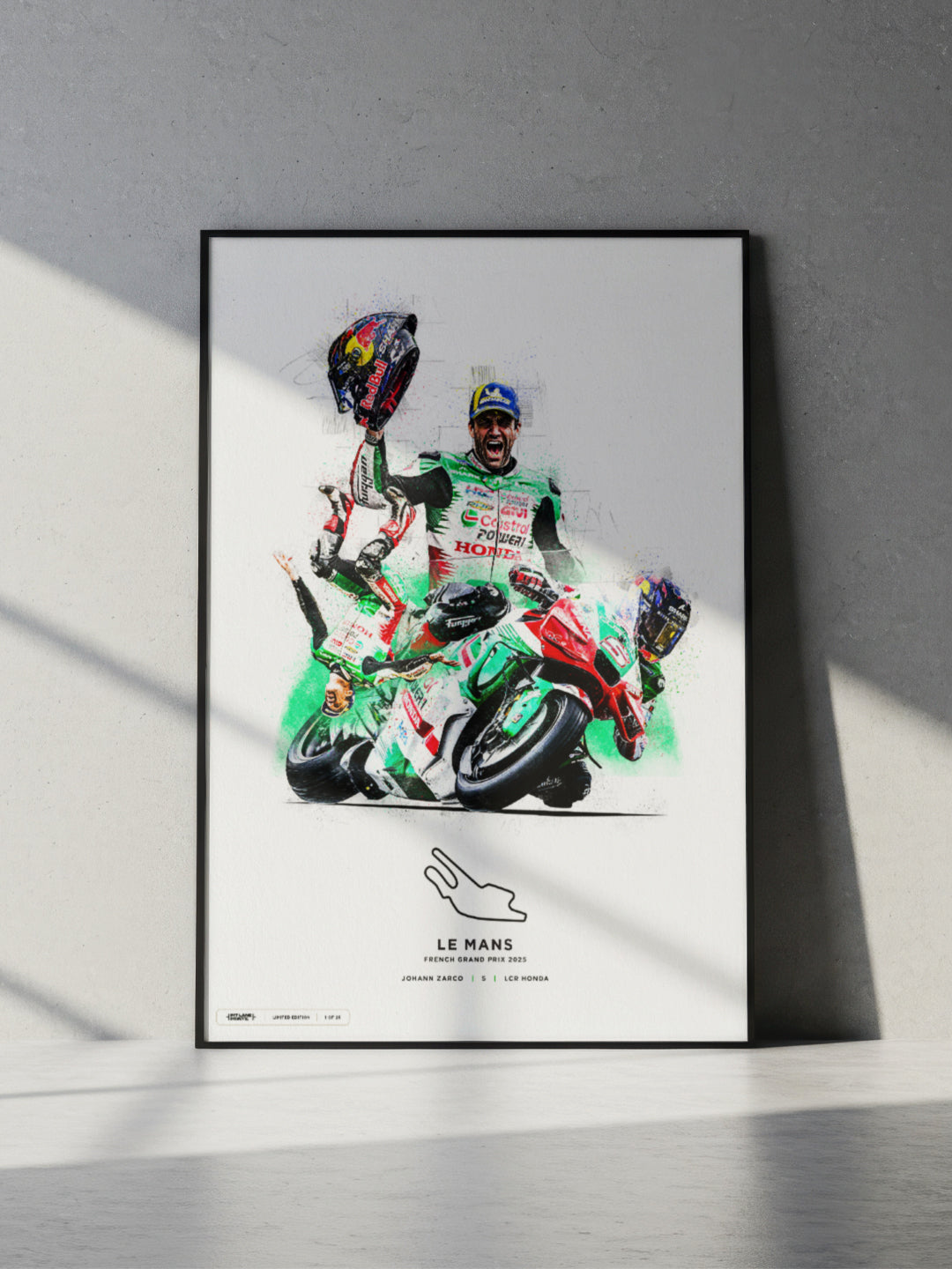 This print captures the raw emotion of the moment, with Zarco celebrating in full Castrol Honda colours, framed by the iconic French countryside and the legendary Le Mans circuit. It’s a must-have piece of memorabilia for MotoGP fans and a proud celebration of one of the most beloved riders in the sport.