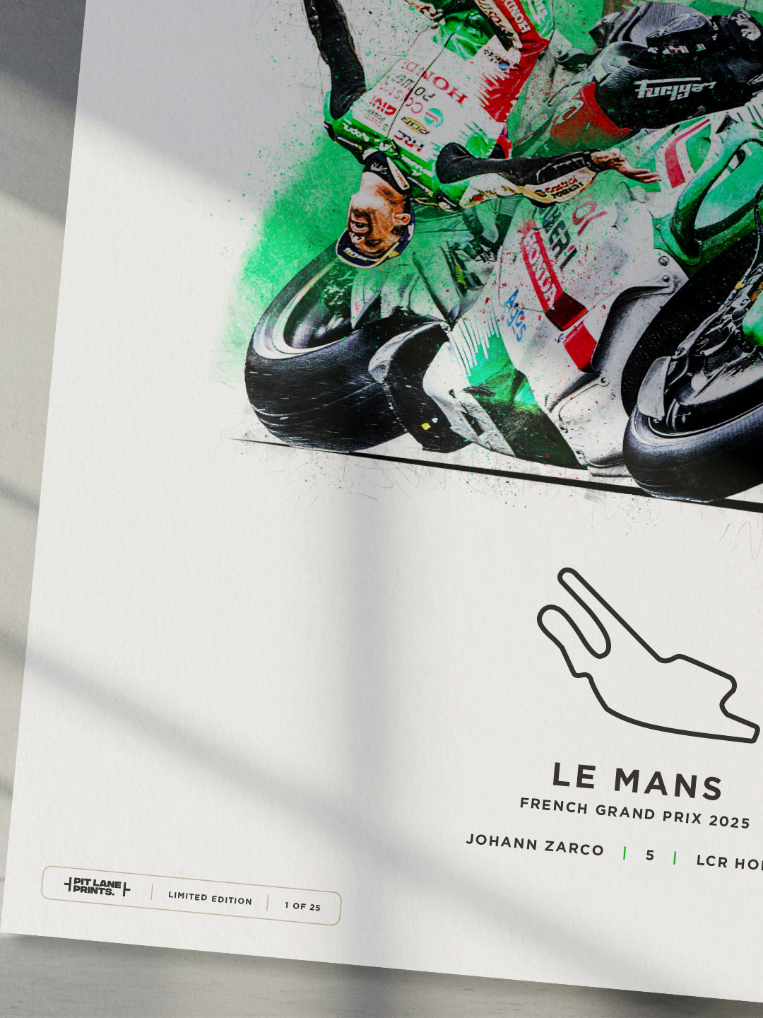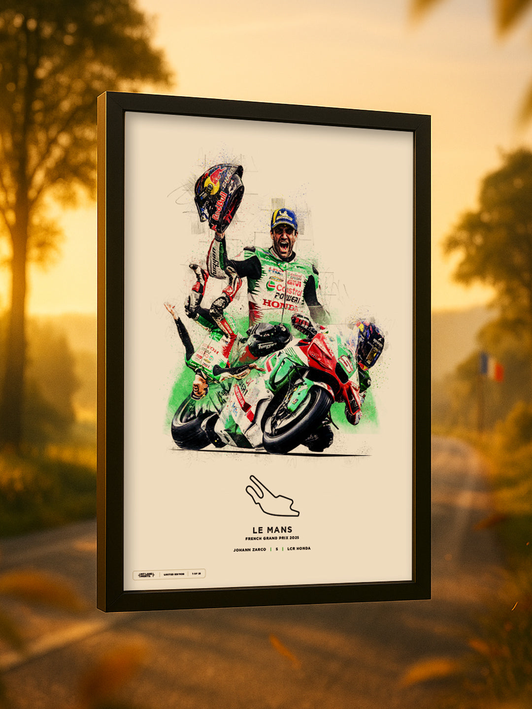 Celebrate a landmark moment in MotoGP with this exclusive limited edition art print commemorating Johann Zarco’s emotional victory at the 2025 French Grand Prix. Racing for LCR Honda, Zarco delivered a spectacular performance at Le Mans to take his first-ever home GP win—an unforgettable triumph in front of a passionate French crowd.