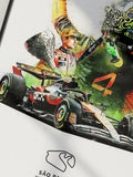 Landoās victory moment and the McLaren MCL60ās striking race trim are layered together with expressive markings and energy lines, giving the print a dynamic, almost explosive feel on the wall.
