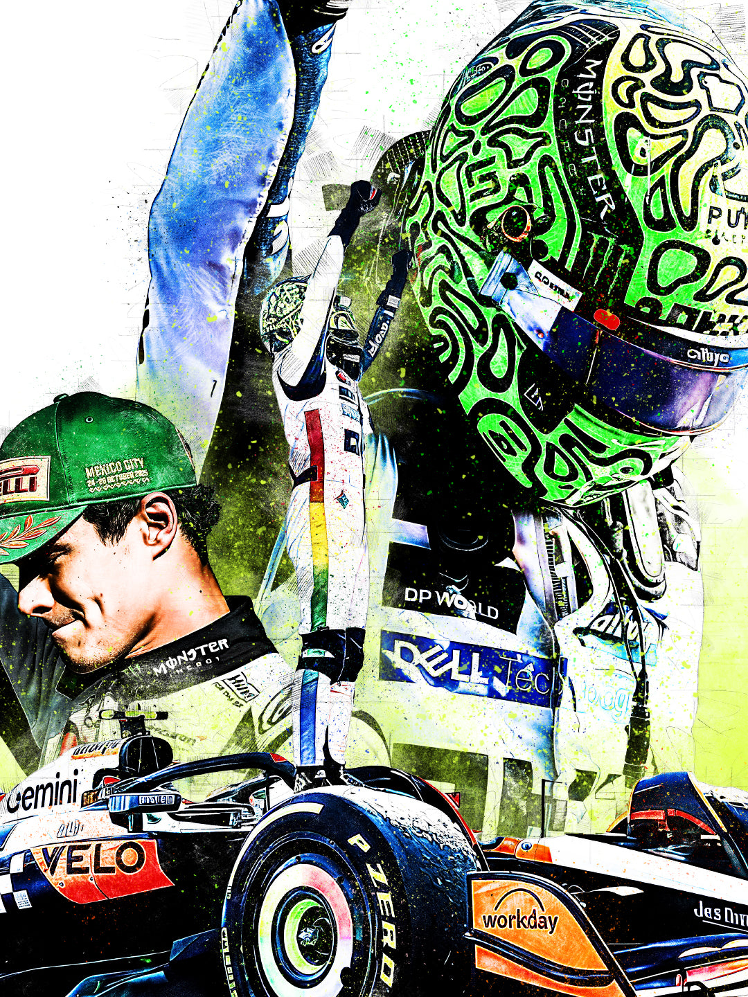 This limited edition print captures the moment McLaren and Norris dominated under the Mexican sun, showcasing Lando’s incredible pace, control and confidence as he stormed to the top step of the podium.