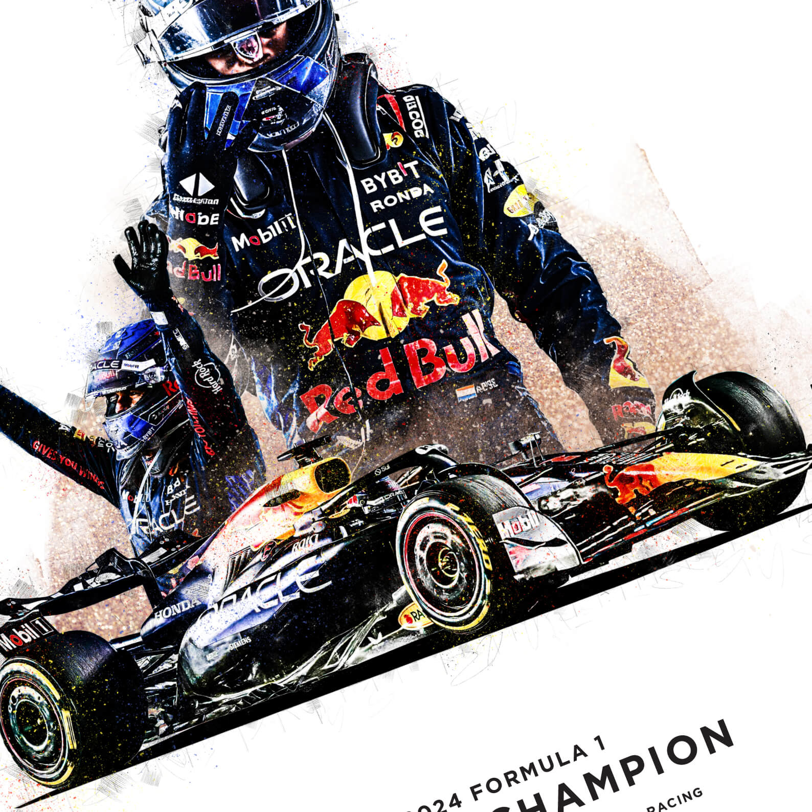The artwork captures the essence of Verstappen's 2024 season, highlighting his exceptional skill and determination that led him to join the elite group of four-time world champions.