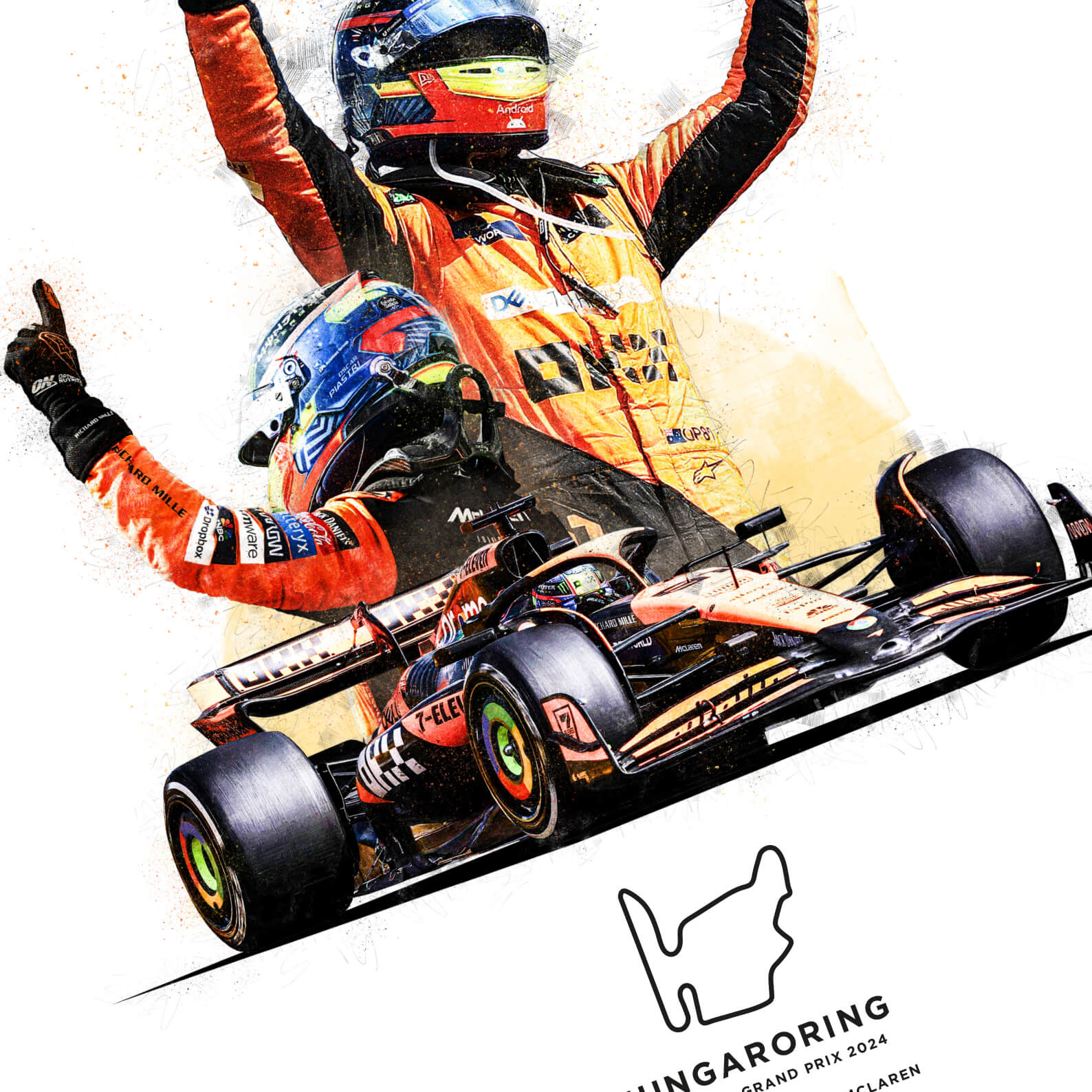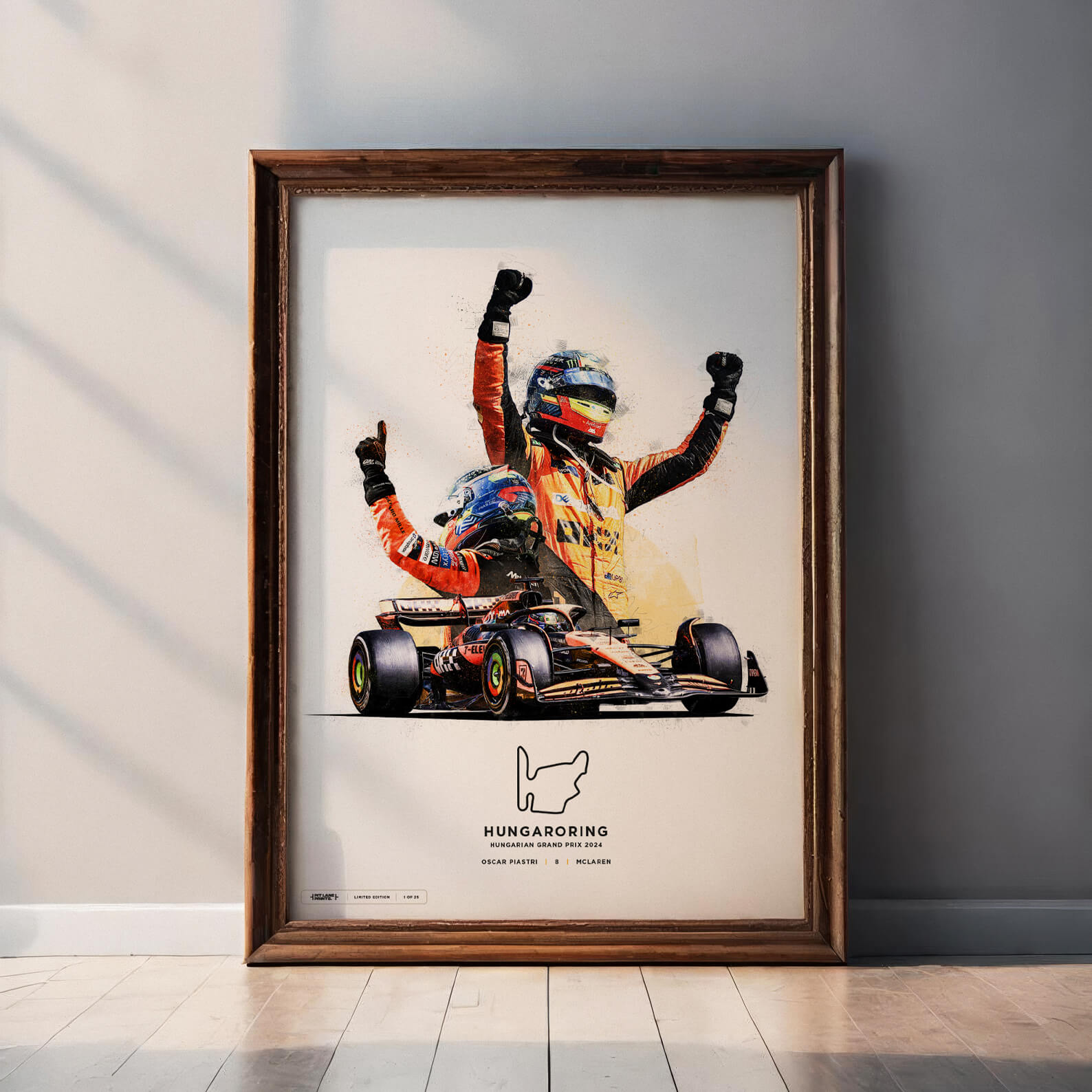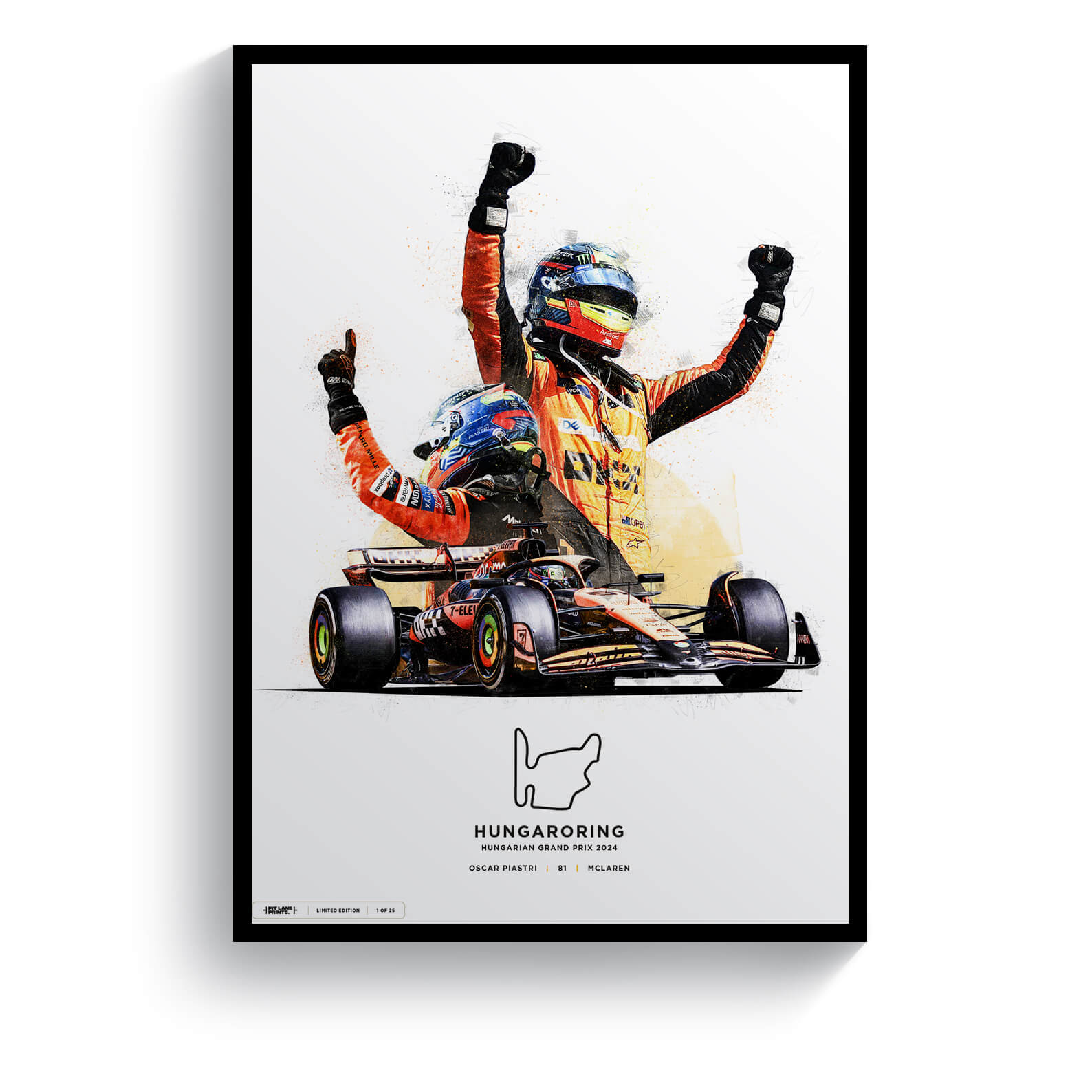 Oscar Piastri took his first Formula 1 victory at the Hungarian Grand Prix. Oscar had the race under control after gaining the lead into turn 1 but was later undercut by his team mate Lando Norris before McLaren switched them back around. Celebrate the young Australian driver's first win with our limited edition artwork.