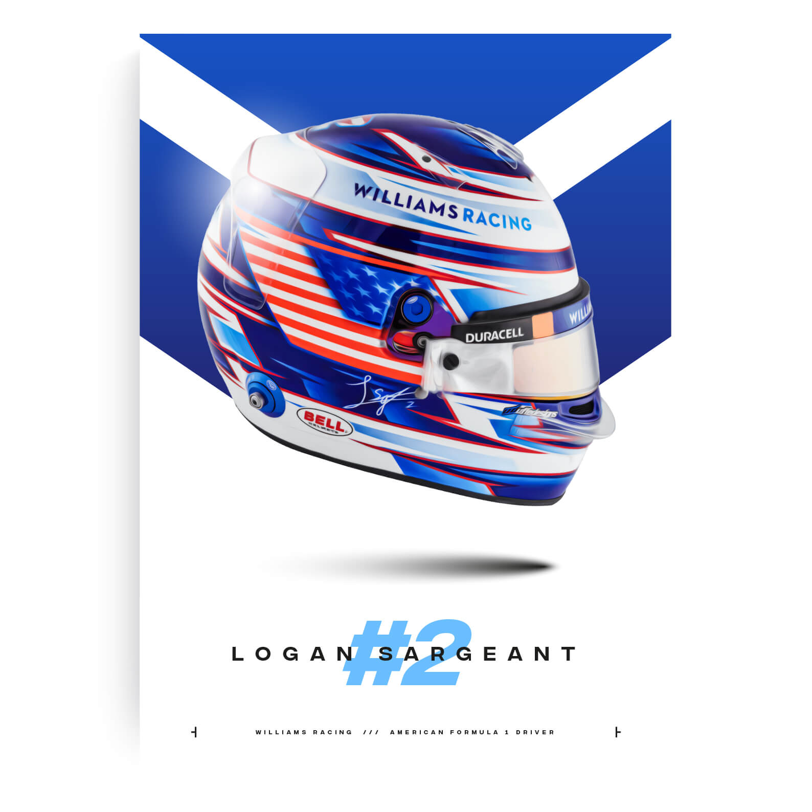 Introducing this stunning print of Logan Sargeant's Formula 1 helmet for the 2023 F1 season! This vibrant and detailed print showcases Sargeant's signature helmet design with meticulous accuracy and acknowledges Sargeant's American heritage and his 2023 team, Williams Racing.