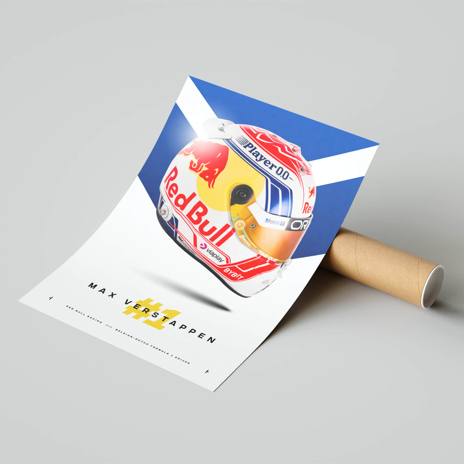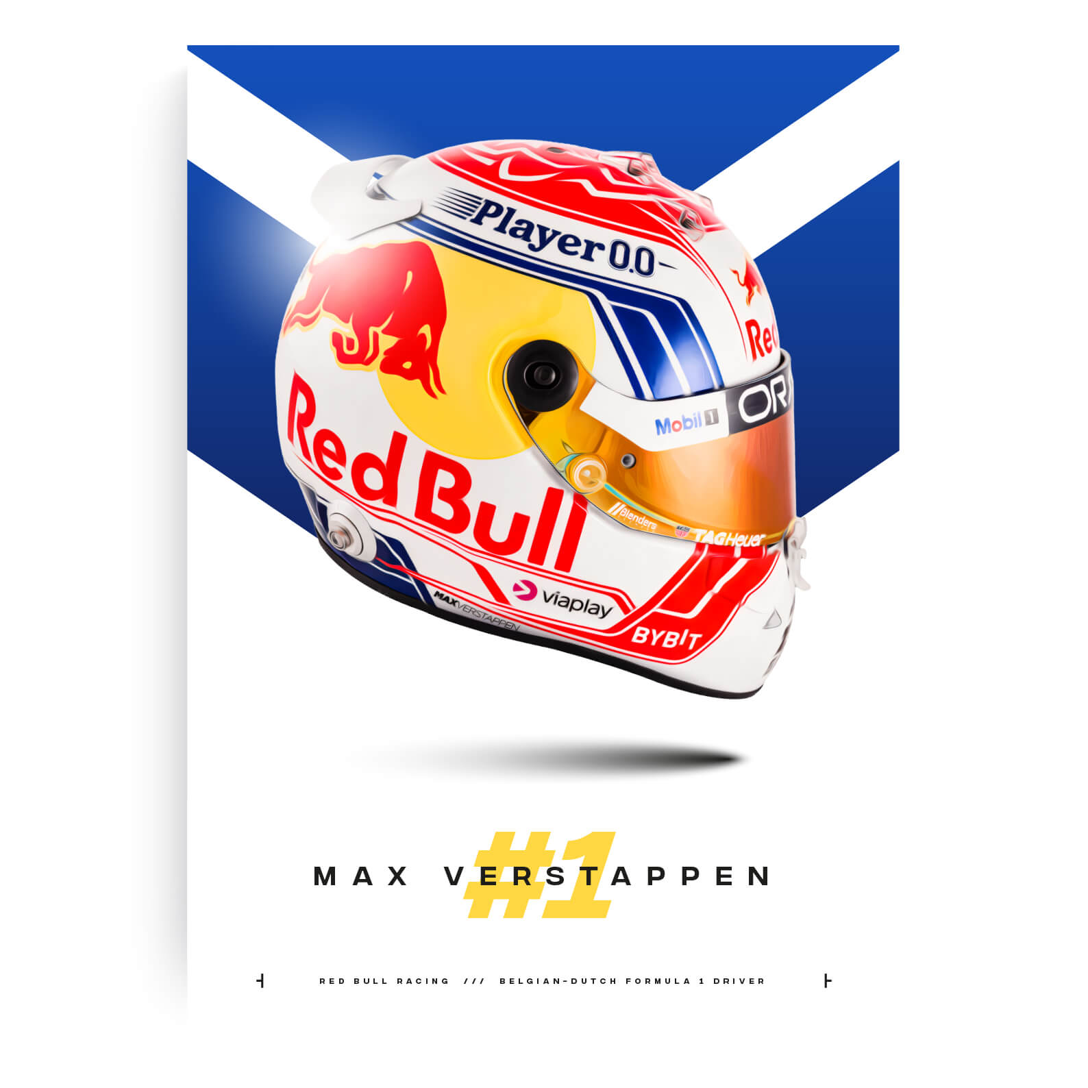 Introducing this stunning print of Max Verstappen's Formula 1 helmet for the 2023 F1 season! This vibrant and detailed print showcases Verstappen's signature helmet design with meticulous accuracy and acknowledges Verstappen's Belgian/Dutch heritage and his 2023 team, Red Bull Racing.