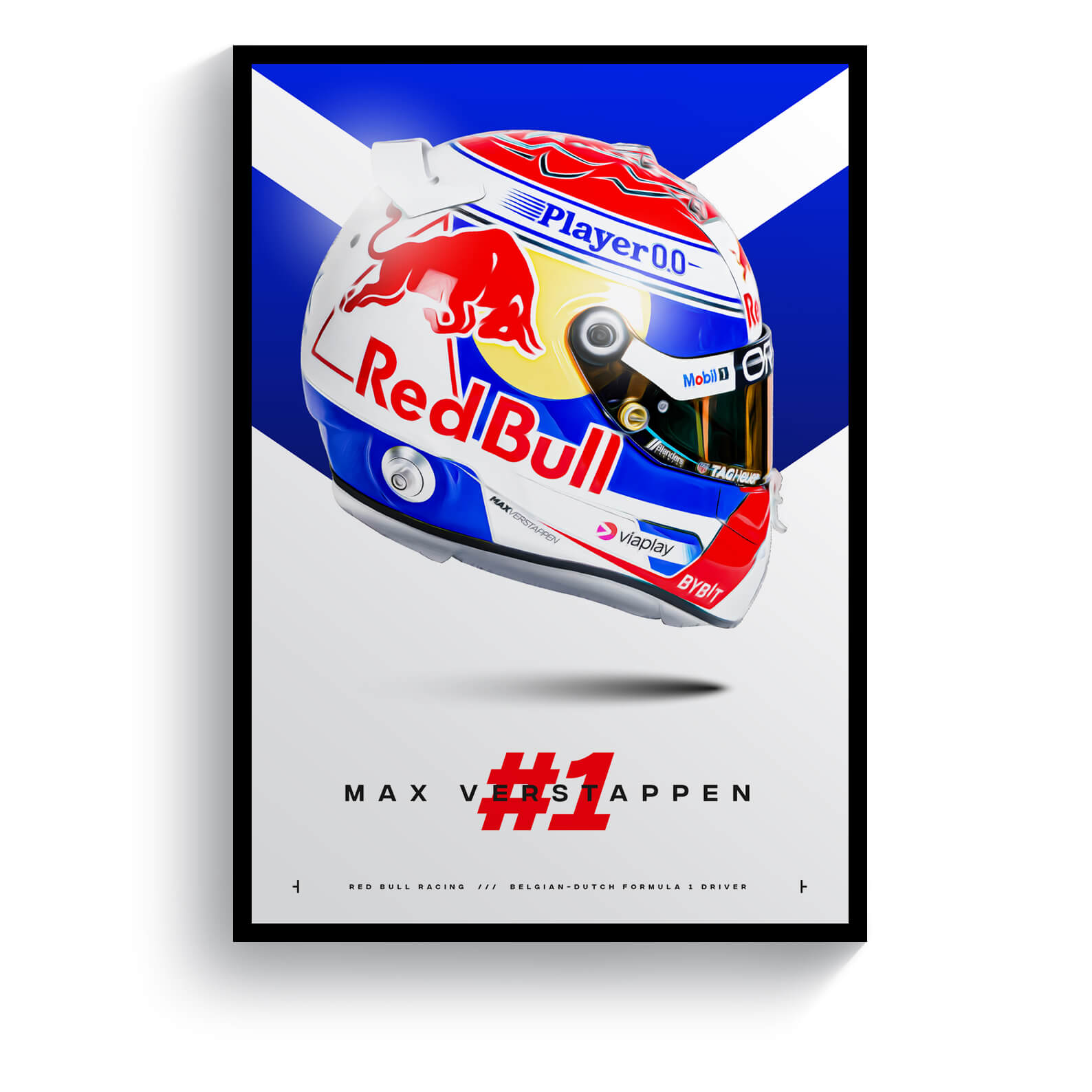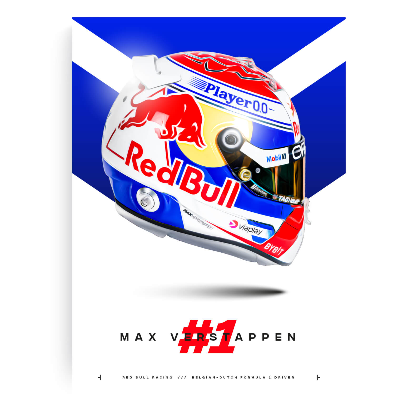 Introducing this stunning print of Max Verstappen's Formula 1 helmet for the 2024 F1 season! This vibrant and detailed print showcases Verstappen's signature helmet design with meticulous accuracy and acknowledges Verstappen's Belgian/Dutch heritage and his 2024 team, Red Bull Racing.