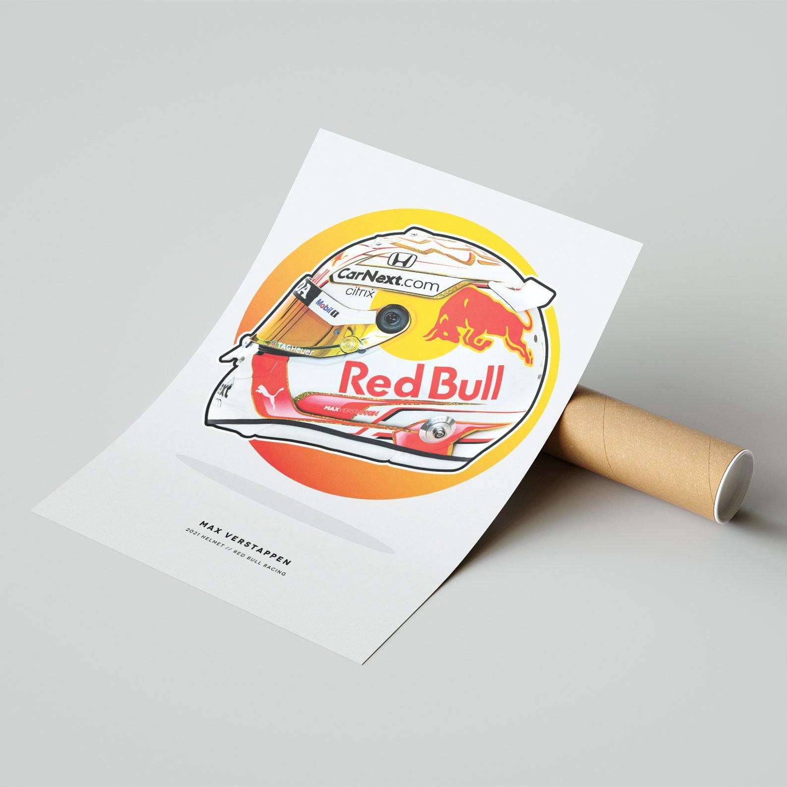 This print showcases Max Verstappen's 2021 season helmet, and is perfect for any fan of the Red Bull Formula 1 racing driver. This print has been digitally painted and would look great in your home, office or garage or it could make the perfect gift for the F1 fan in your life.