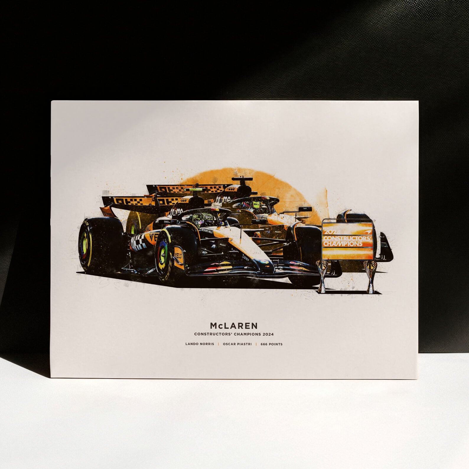 Celebrate McLaren's triumphant return to the pinnacle of Formula 1 with this exclusive art print, commemorating the team's 2024 Constructors' Championship victory—their first in 26 years.
