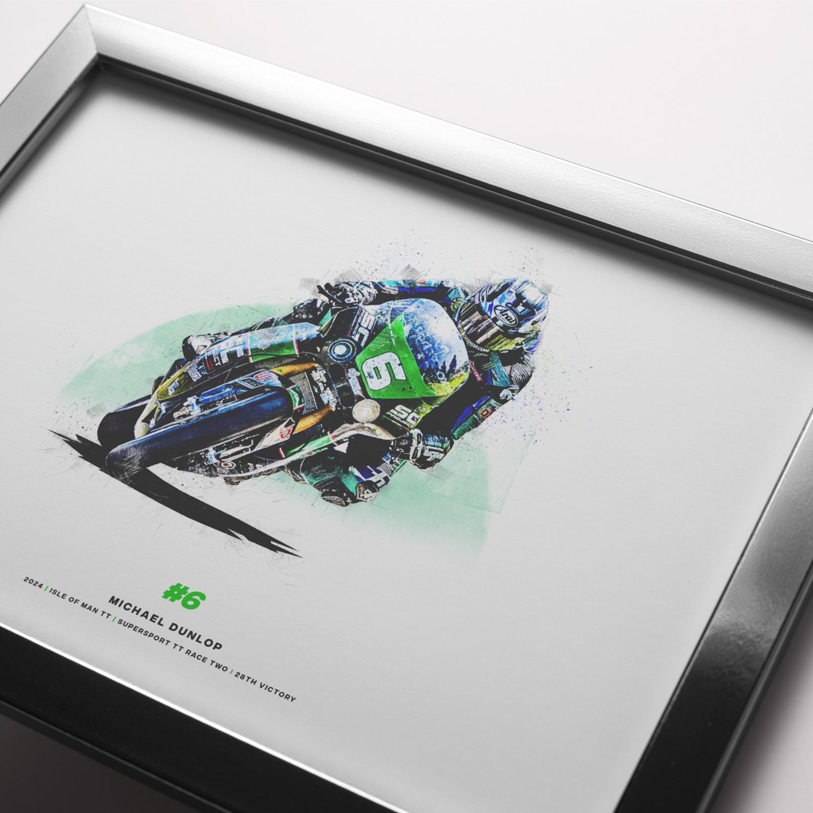 This print showcases Michael Dunlop at the Isle of Man TT 2024 where he won the Monster Energy Supersport TT Race 2 by just under four seconds. This print is to celebrate his 28th TT victory, surpassing his uncle, Joey Dunlop's record of 26 victories.