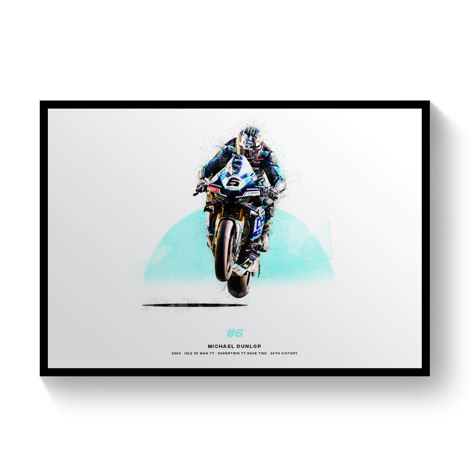This print showcases Michael Dunlop at the Isle of Man TT 2024 where he won the Supertwin TT Race 2. This print is to celebrate his 29th TT victory, surpassing his uncle, Joey Dunlop's record of 26 victories.
