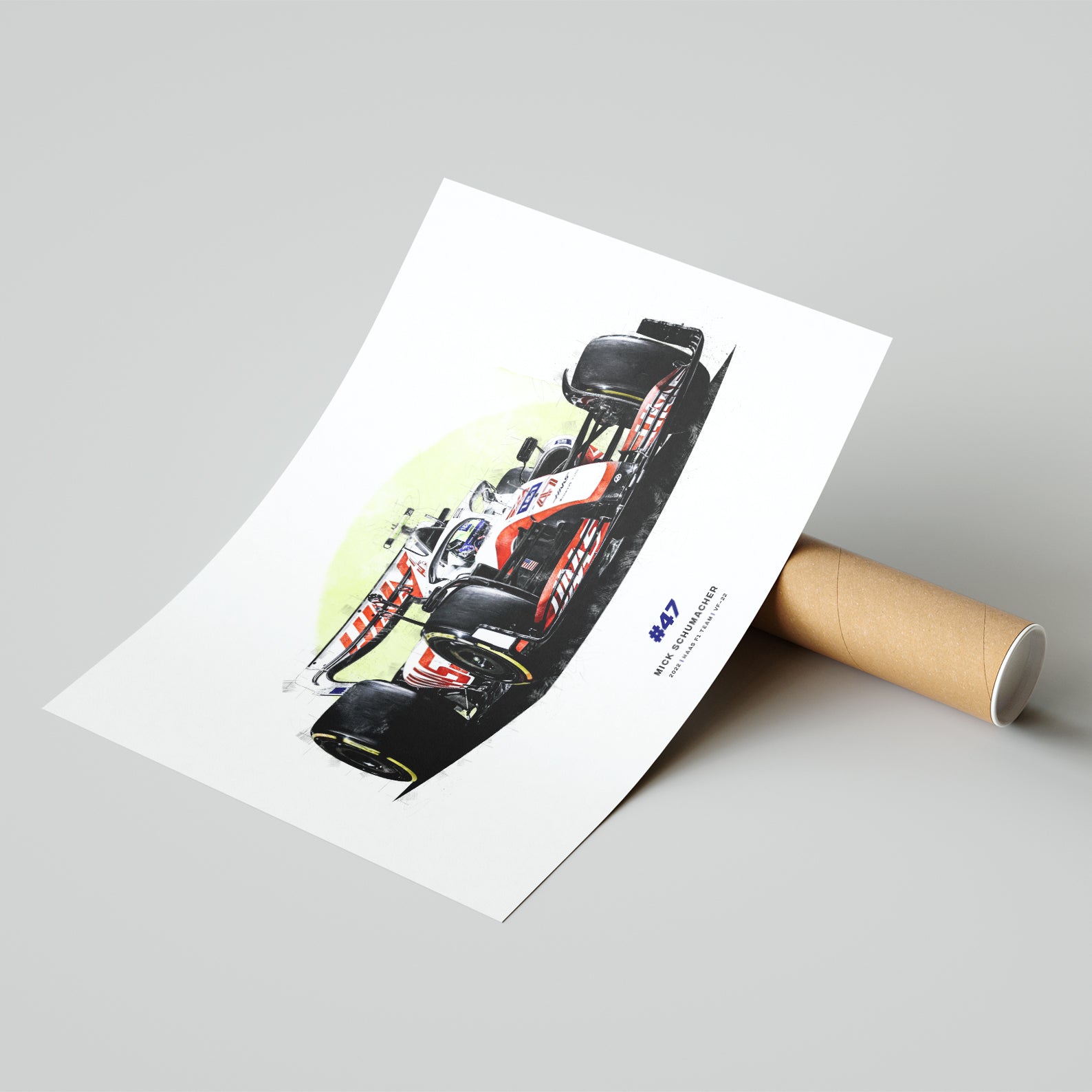 This print showcases Mick Schumacher's 2022 car, Haas' VF-22 and is perfect for any fan of the German Formula 1 racing driver. This print has been digitally drawn and would look great in your home, office or garage or it could make the perfect gift for the F1 fan in your life.