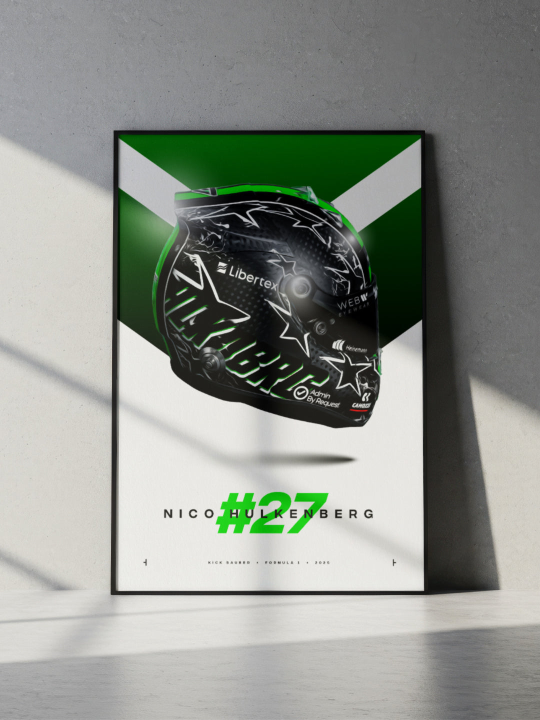 Introducing this stunning print of Nico Hulkenberg's Formula 1 helmet for the 2025 F1 season! This vibrant and detailed print showcases Hulkenberg's signature helmet design with meticulous accuracy and his 2025 team, Kick Sauber.