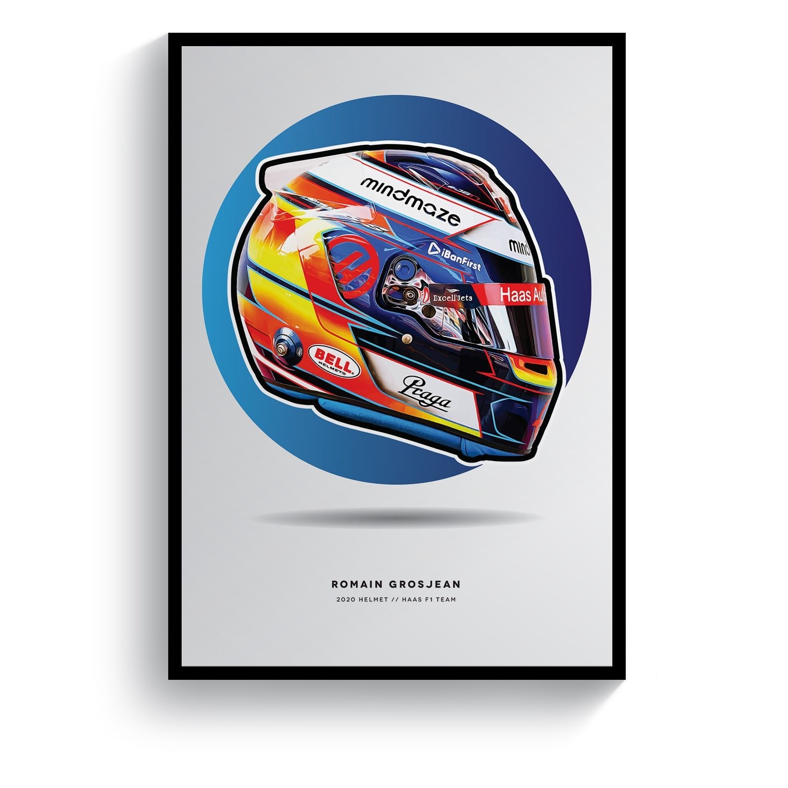 This print showcases Romain Grosjean's 2020 season helmet and is perfect for any fan of the Haas Formula 1 racing driver. Romain suffered one of the worst crashes we have seen in many years at the 2020 Bahrain grand prix and credited the halo on the car for saving his life. This print would look great in your home, office or garage or it could make the perfect gift for the F1 fan in your life.