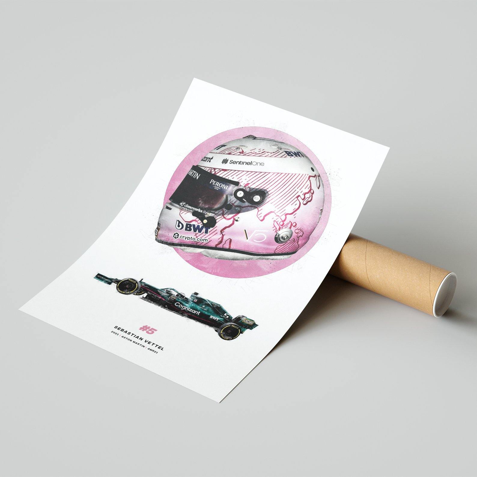 This print showcases Sebastian Vettel's 2021 season helmet and Aston Martin AMR21, and is perfect for any fan of the Aston Martin Formula 1 racing driver. This print has been digitally painted and would look great in your home, office or garage or it could make the perfect gift for the F1 fan in your life.