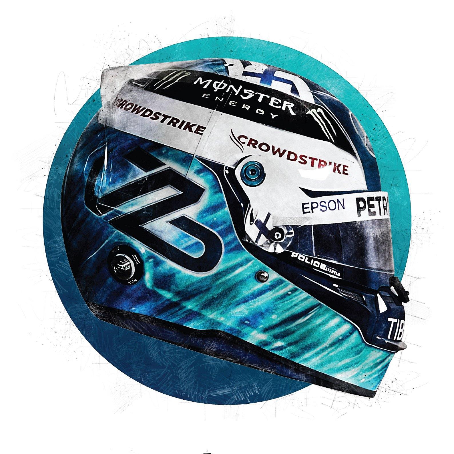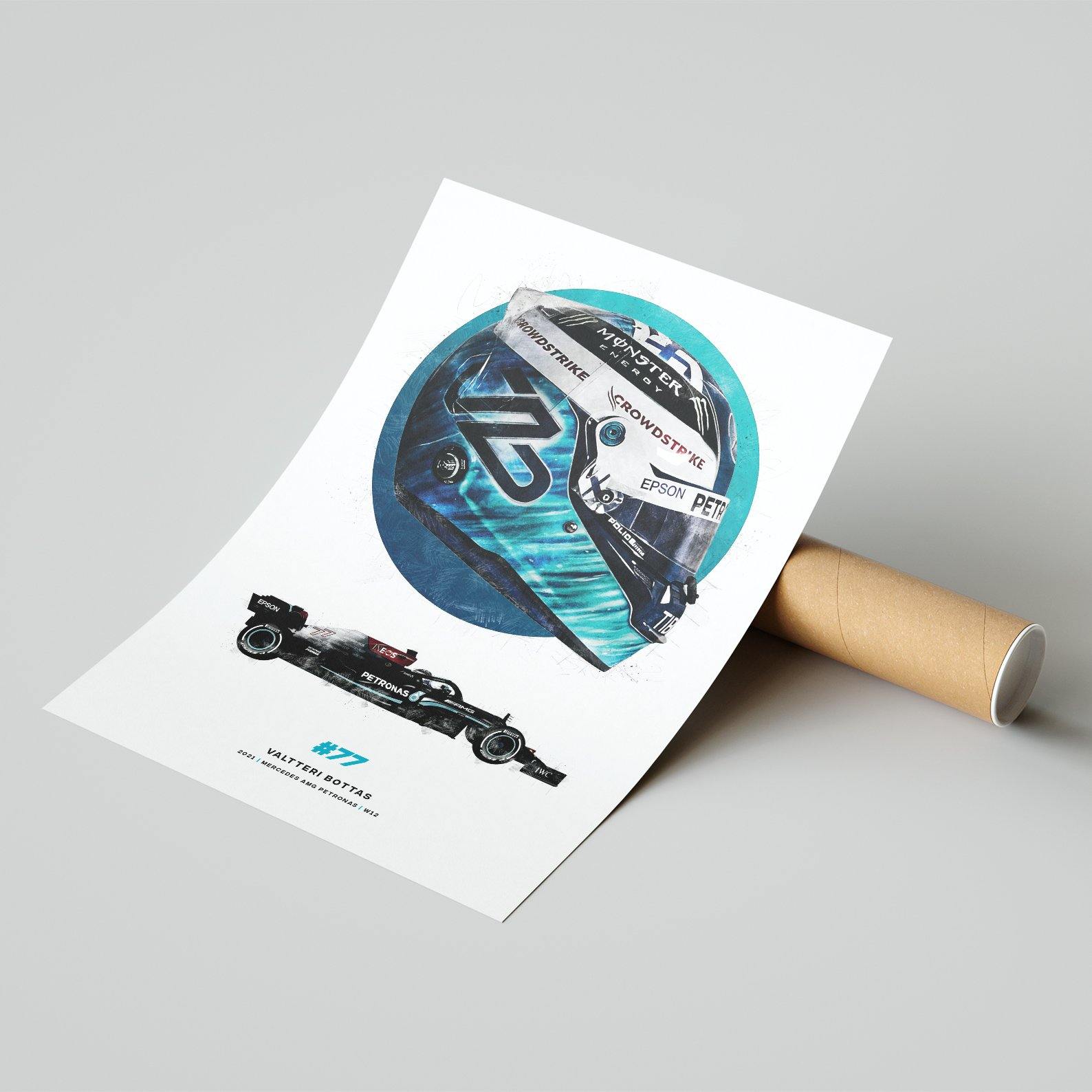 This print showcases Valtteri Bottas' 2021 season helmet and Mercedes AMG Petronas W12 car, and is perfect for any fan of the Mercedes Formula 1 racing driver. This print would look great in your home, office or garage or it could make the perfect gift for the F1 fan in your life.